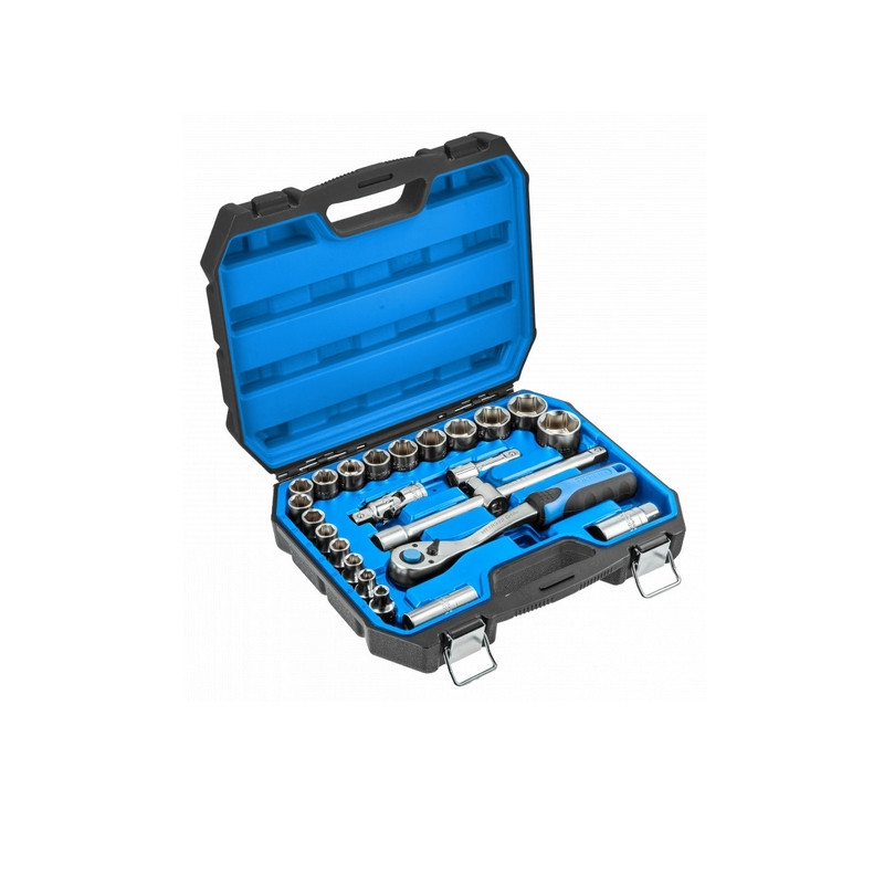 Набір з 24 предметів, що складається з тріскачки, насадок та іншого приладдя 1/2”. Незамінний у будь-якій майстерні чи автосервісі.