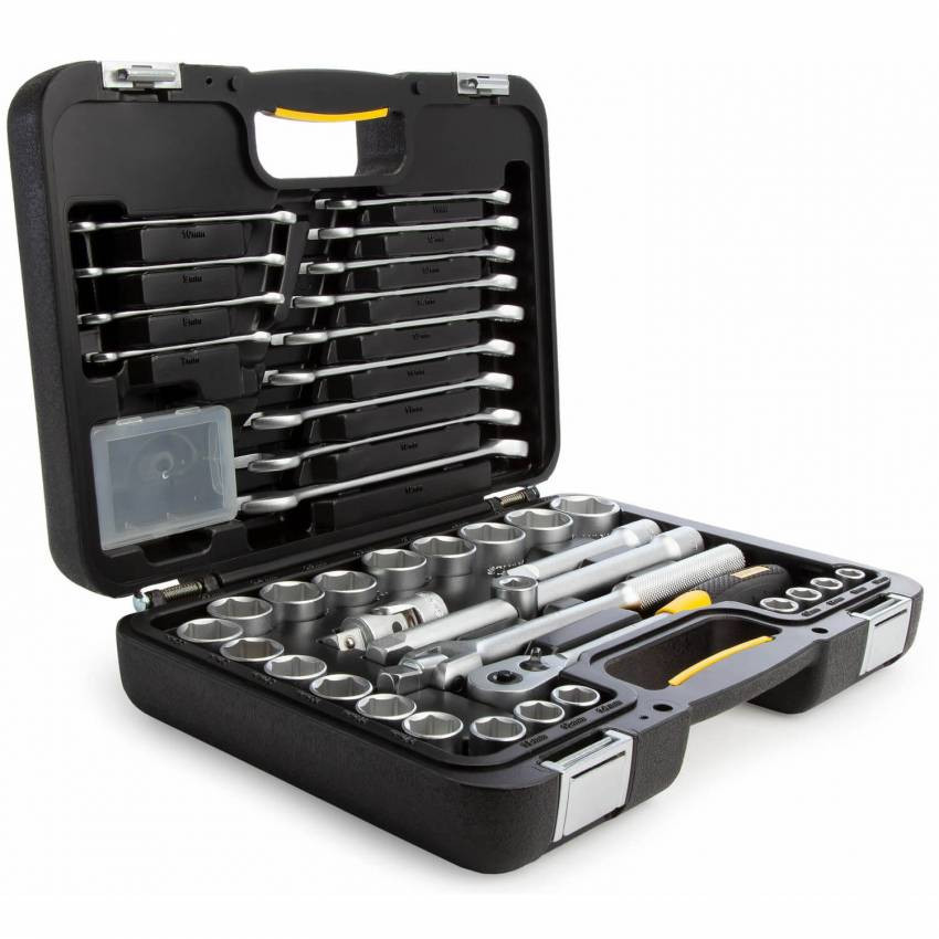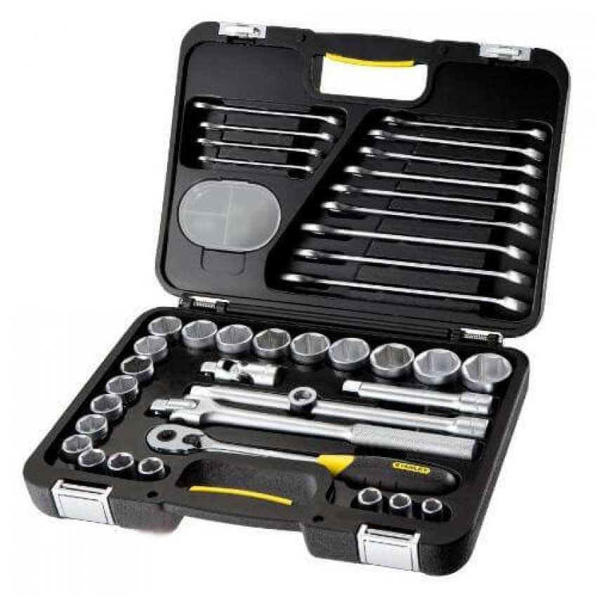 Набір торцевих головок 1/2' STANLEY 'Expert', (40 предметів). Склад набору: головки торцеві 1/2' 6-гранні (21 шт.): 10-11-12-13-14-15-16-17-18-19-20-21-22-23-24-25- 26-27-28-30-32мм, рукоятка з храповим механізмом 1/2', подовжувачі 1/2': 125, 250 мм (з інтегрованим перехідником 1/2'M - 3/8'F мм), рукоятка з шарніром 1/2', шарнір карданний 1/2', ключі комбіновані 'FatMax' (13 шт.): 7-8-9-10-11-12-13-14-15-16-17-18-19мм.