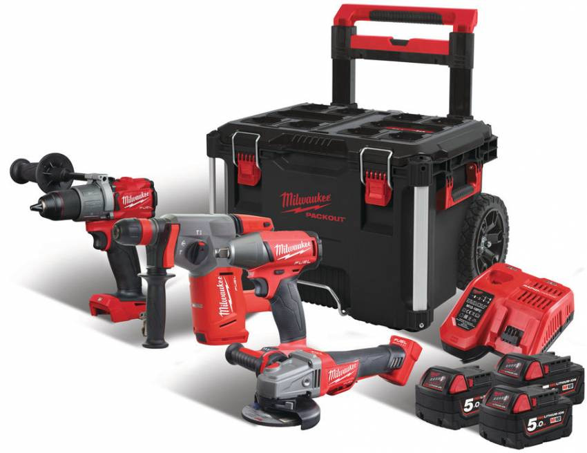 Про товар Набір акумуляторного інструменту MILWAUKEE, M18FPP4A-503P (FPD2, FIWF12, CHX, CAG125XPDB зарядний пристрій, 3 акум.Х 5Ач, ящик на колесах PACKOUT)