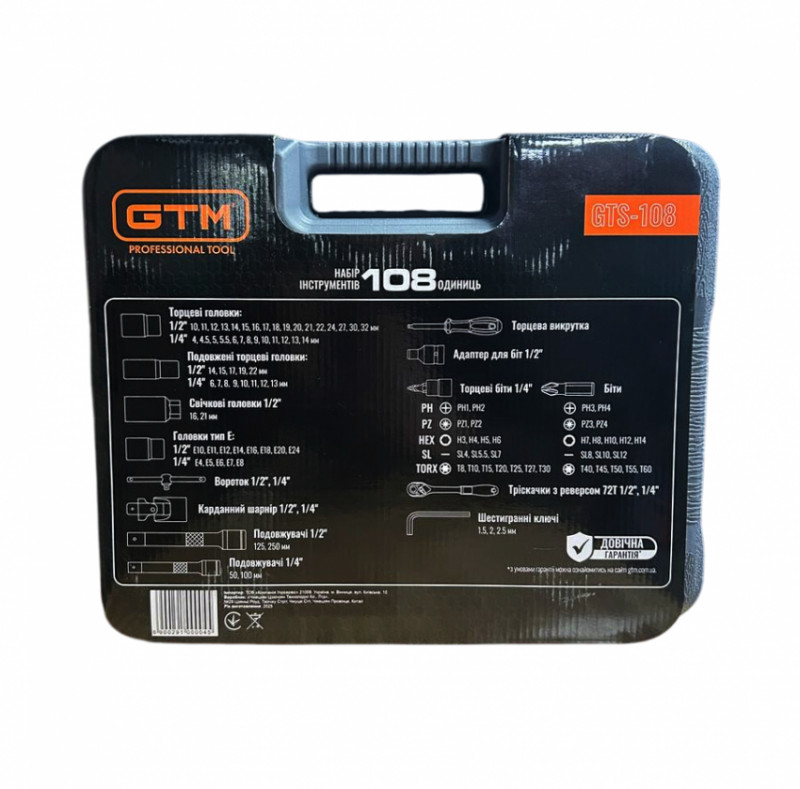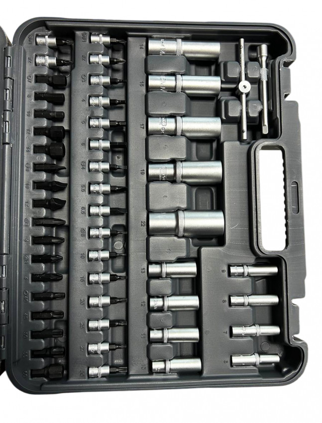 Торцеві біти 1/4'': PH: 1,2 PZ: 1, 2 HEX: 3, 4, 5, 6 SL: 4, 5.5, 7 T: 8, 10, 15, 20, 25, 27, 30;