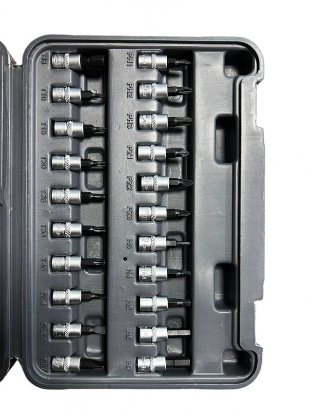 | Торцеві біти 1/4" | PH1, PH2, PH3, PZ1, PZ2, PZ3, H3, H4, H5, H6, H7, H8, SL4, SL5.5, SL7, T8, T10, T15, T20, T25, T30, T40 |