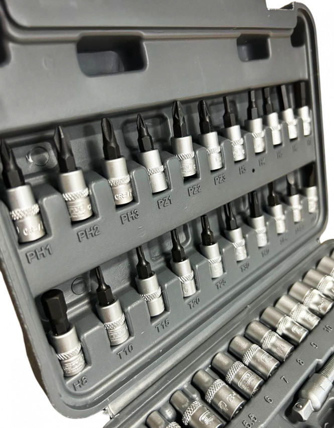 Торцеві біти 1/4"": PH: 1, 2, 3 PZ: 1, 2, 3 HEX: 3, 4, 5, 6, 7, 8 SL: 4, 5.5, 7 T: 8, 10, 15, 20, 25, 30, 40