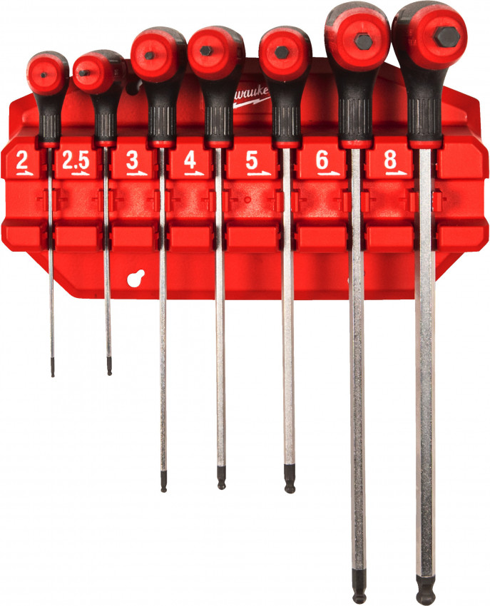 Набір ключів Г-образних MILWAUKEE з комфортною ручкою, Hex з кулькою. (7шт) (2/2,5/3/4/5/6/8мм)