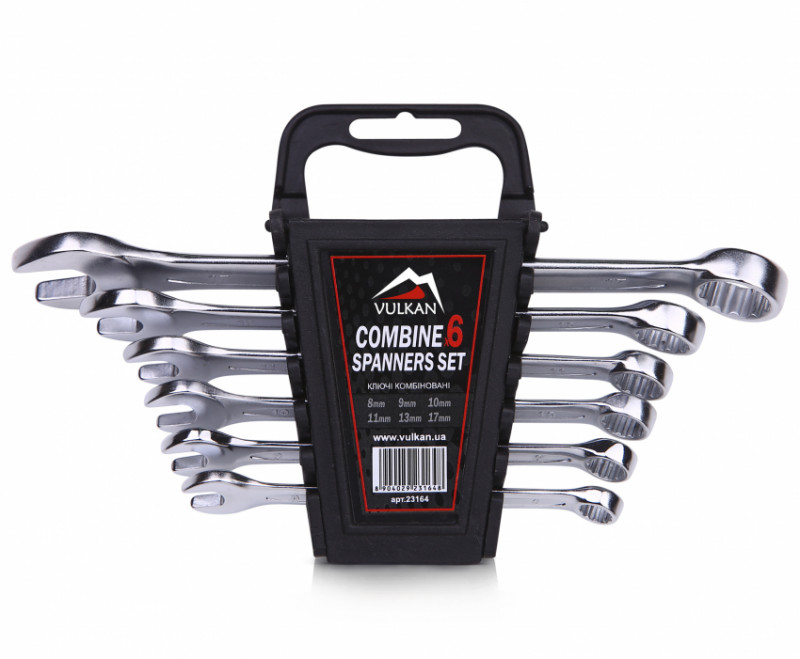 Набір комбінованих ключів Vulkan 8-17 мм складається з 6 комбінованих ріжково-накидних ключів для закручування / викручування болтів, гайок і інших різьбових з'єднань для професійного використання. Даний набір поставляється в зручному пластиковому футлярі, який легко можна повісити на стіну або поставити на полицю в умовах автосервісу, майстерні та виробництва. Виготовлений методом холодної штамповки з хром-ванадієвої сталі. Завдяки додатковому загартуванню твердість відкритої за кільцевої робочих частин ключа досягає 47HRC. Захисне матове декоративне покриття має високу стійкість до стирання, забезпечує збереження зовнішнього вигляду ключів без утворення дефектів та окислення протягом тривалого часу. Середній робочий крутний момент (до утворення видимих деформацій) - 50 Нм. Виготовлений згідно з стандартами DIN3113 та ГОСТ 16983-80.