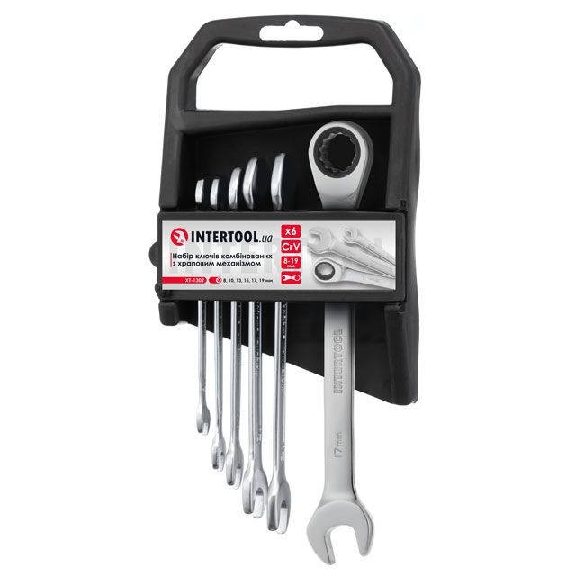 Набір ріжково-накидних ключів з тріскачкою INTERTOOL XT-1302 містить найпопулярніші розміри: 8, 10, 13, 15, 17, 19 мм, що дозволяє підібрати необхідний ключ під будь-які завдання для монтажу і демонтажу різьбових з'єднань гайок і болтів.