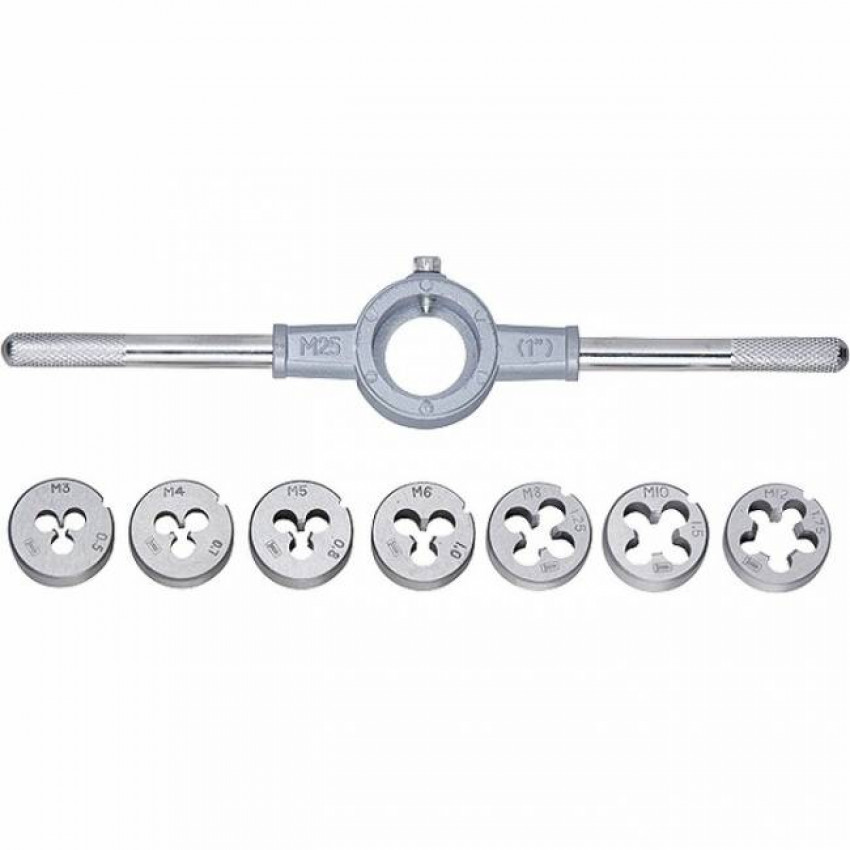 Призначений для нарізки внутрішнього різьблення різного діаметра. Підходить для роботи з кольоровими металами та сталями, межа міцності яких становить 800 Н/мм2. ._x000D__x000D_Склад: _x000D__x000D__x000D__x000D_Плашкы - служат для нарезания наружной метрической резьбы с мелким и стандартным кроком._x000D__x000D_Плашкотримачи со стопорными винтами обеспечивают стойкую фиксацию и центрирование плашки._x000D__x000D__x000D__x000D_Склад комплекта: _x000D__x000D__x000D__x000D_Плашкы: М3 x 0.5 мм, М4 x 0.7 мм, М5 x 0.8 мм, М6 x 1 мм, М8 х 1.25 мм, М10 х 1.5 мм, М12 х 1.75 мм. Плашкотримач: М3-М12