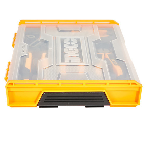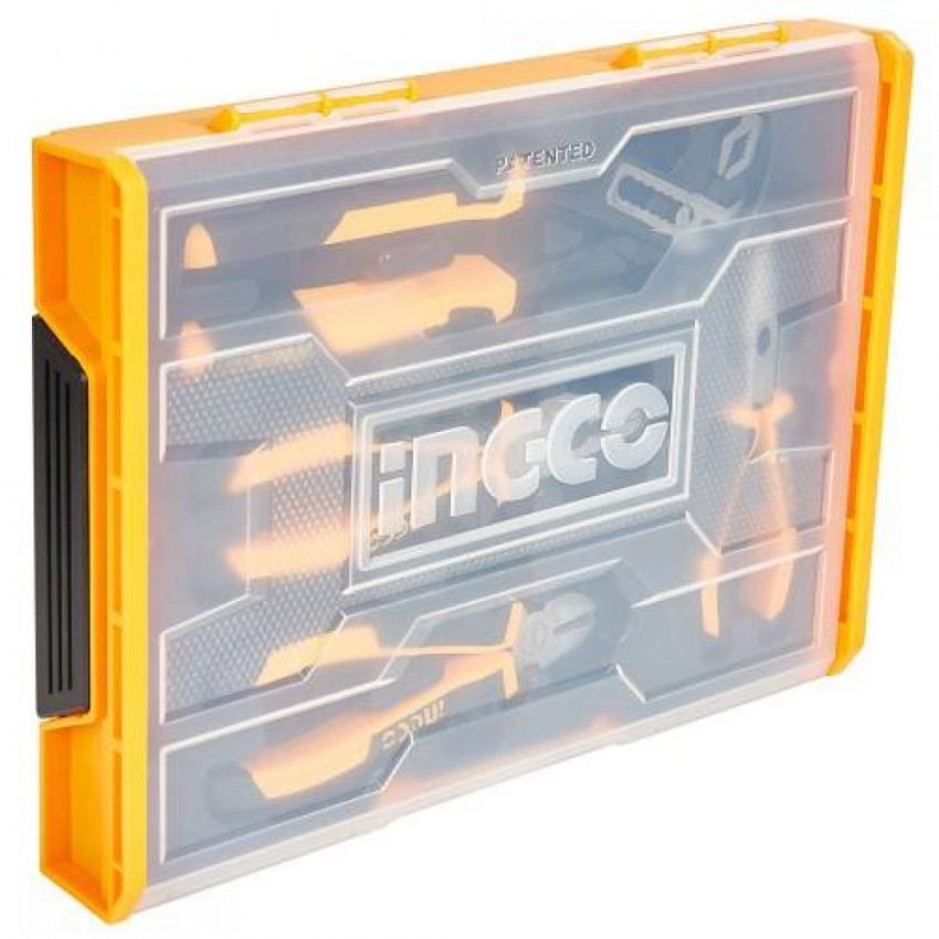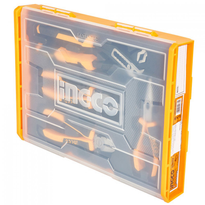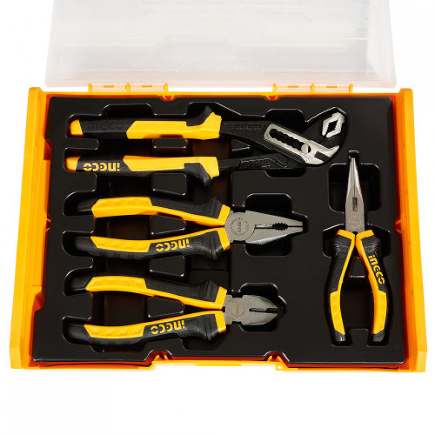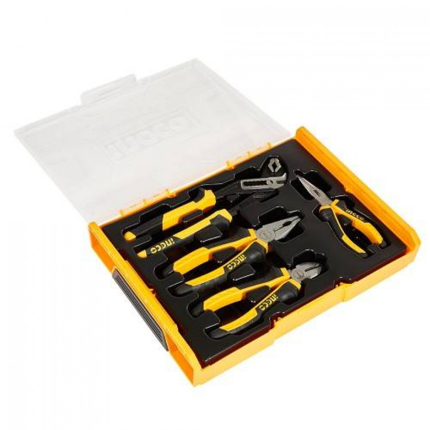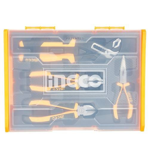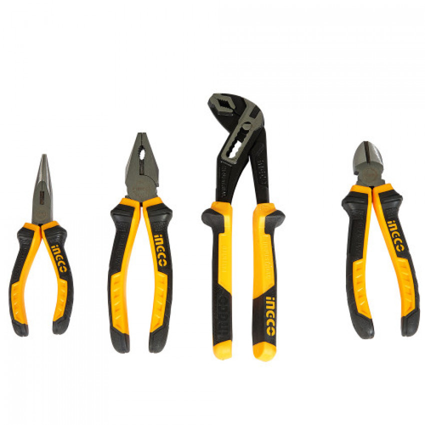 Набір шарнірно-губцевого інструменту 4 предмети INGCO - комплект, що складається з чотирьох предметів: комбінованих плоскогубців, бокорізів, довгогубців та переставних кліщів. Такий набір дуже зручний для виконання різних операцій у галузі слюсарно-монтажних робіт. Інструменти виготовлені з високоякісної хромованадієвої інструментальної сталі. Двокомпонентні ергономічні рукоятки плоскогубців забезпечують комфорт при роботі та виключають вислизання інструменту з рук. Запаковано у пластиковий бокс.
