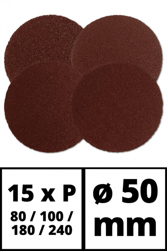 Оригінальний набір наждачного паперу Einhell для дерева містить різноманітні наждачні папери різної зернистості. Особливо підходить для пневматичнї кутової шліфувальної машини Einhell TC-PA 50. Абразивний матеріал має діаметр 50 мм. Таким чином, вони також підходять для інших відповідних кутових шліфувальних машин або шліфувальних пристроїв з шліфувальним диском Ø 50 мм і системою кріплення "липучка". Завдяки наждачному паперу P80, P100, P180 і P240, який входить в комплект поставки, набір підходить для різноманітних шліфувальних робіт на плоских і криволінійних дерев'яних поверхнях. Комплект поставки складає 60 шт шліфувальних дисків по 15 шт кожної зернистості (P80, P100, P180 і P240).