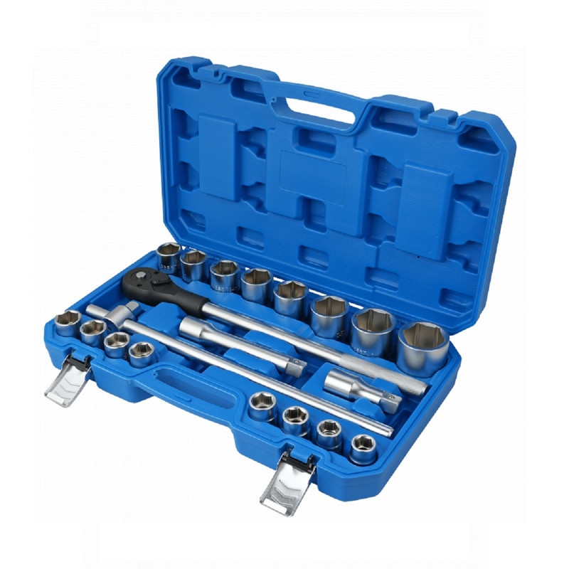 Набір з 21 предмета, що складається з тріскачки, торцевих голівок та інших аксесуарів 3/4”. Незамінний для будь-якої майстерні або автосервісу.