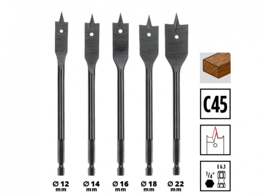 5 плоских свердел по дереву (12-22 мм) зі сталі C45 з хвостовиком E 6.3