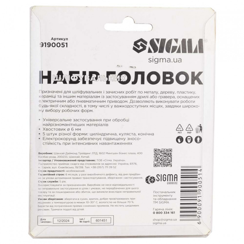 Набір головок шліфувальних 5шт хвостовик Ø6мм Sigma 9190051 призначений для видалення задирок, згладжування зварних швів, чистового шліфування поверхонь, для роботи по металу, склу, кераміці та пластику, для встановлення в міні-дрилі, прямі шліфувальні машини та. Купити набір головок шліфувальних Sigma Ви можете, оформивши замовлення в нашому інтернет-магазині за допомогою простої форми, доставка здійснюється по всій Україні. Якщо у Вас виникли запитання, Ви можете зателефонувати за вказаними номерами або замовити зворотній дзвінок. Спеціалісти нашого інтернет-магазину нададуть Вам детальні консультації та допоможуть зробити правильний вибір.