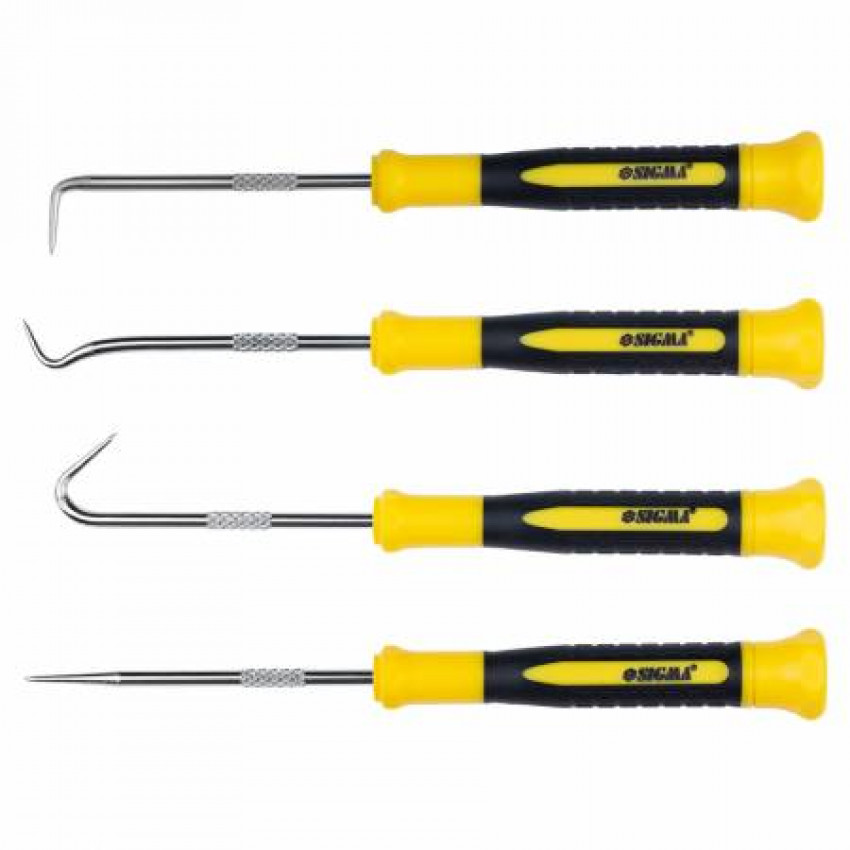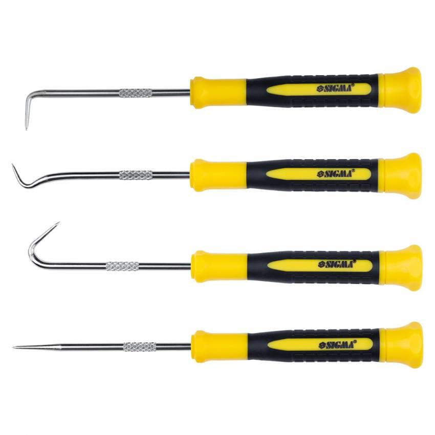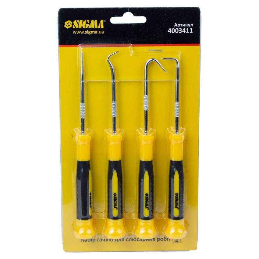 Набір гачків для слюсарних робіт 4шт SIGMA (4003411) - для демонтажу манжет, сальників і кілець ущільнювачів малих розмірів вузлів і агрегатів автомобільної техніки, розташованих у важкодоступних місцях.