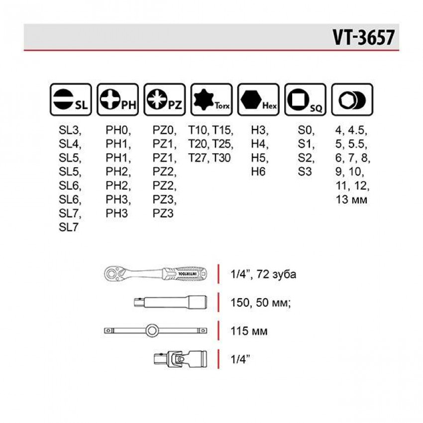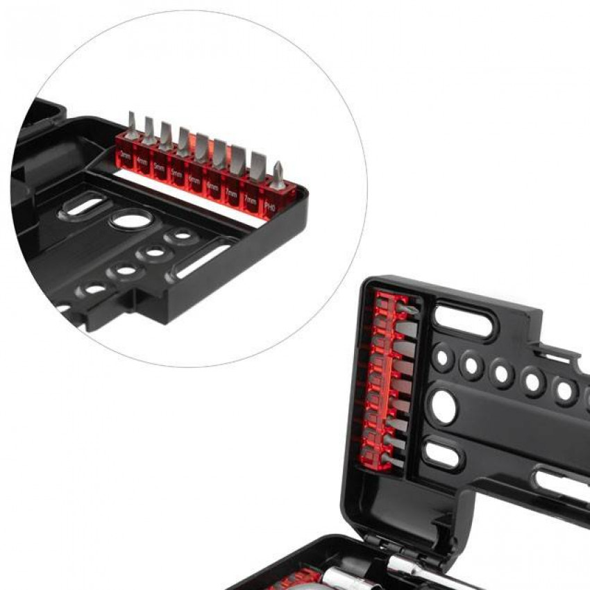 Широка комплектація набору дозволяє працювати з дрібними і середніми кріпленнями в механізмах і вузлах автомобіля, мотоцикла та іншої техніки. Подовжувач, кардан, вороток з плаваючою головкою, Г-подібні ключі дозволяють працювати у важкодоступних місцях. Різноманіття біт дозволяє використовувати набір для ремонту будь-якої побутової техніки.