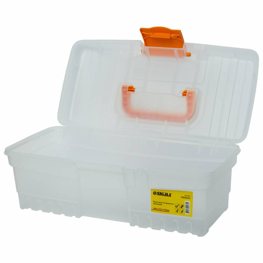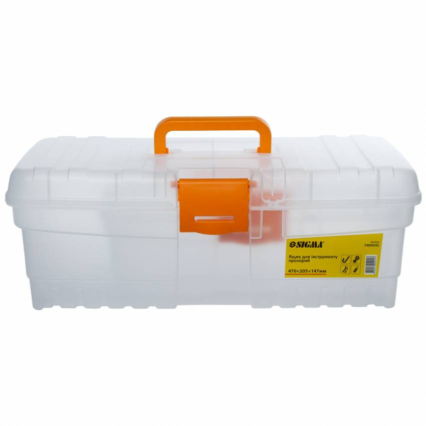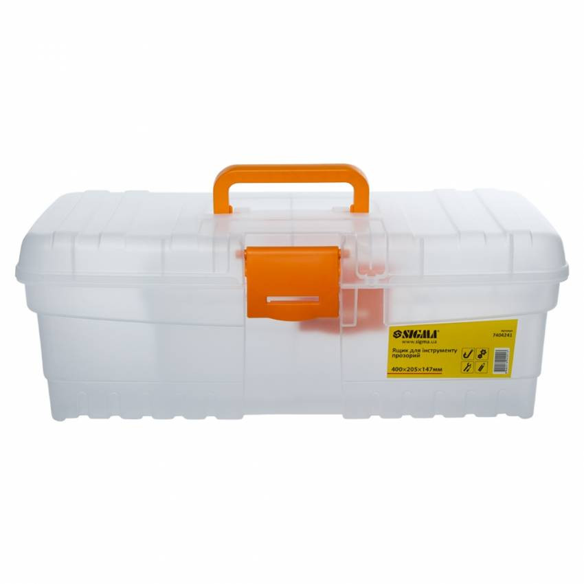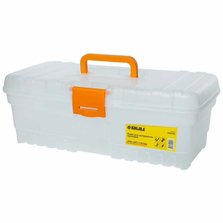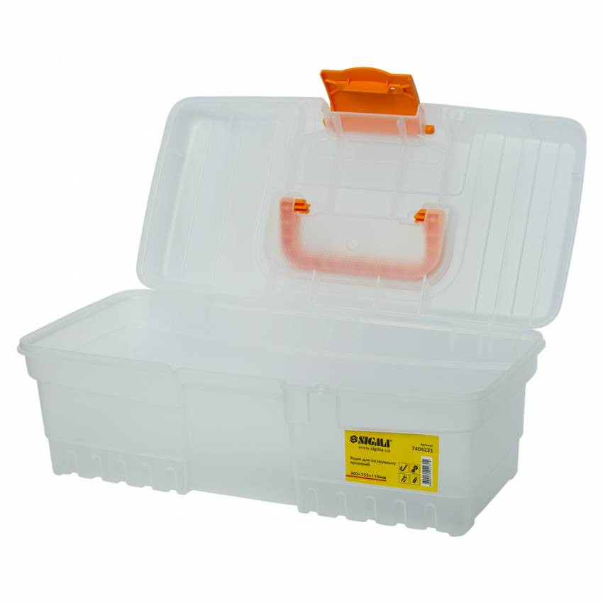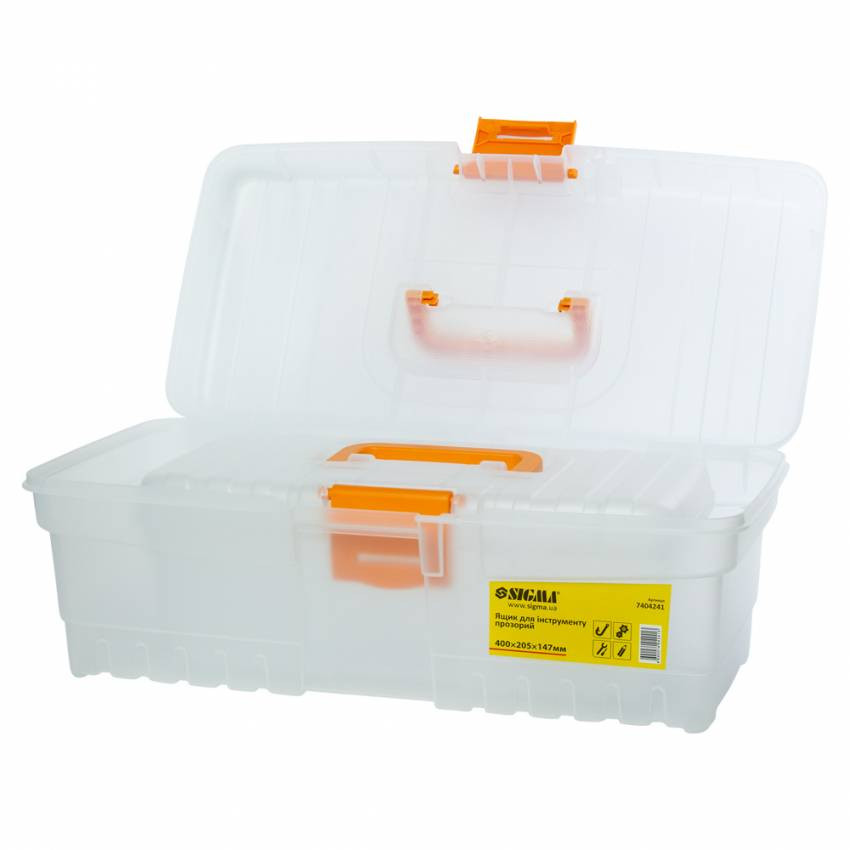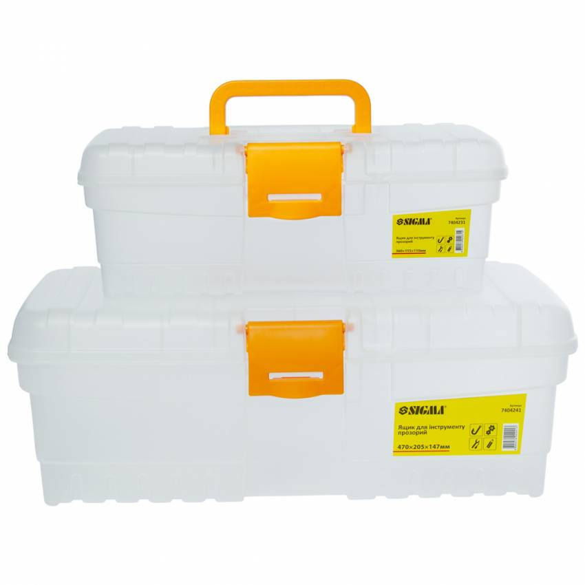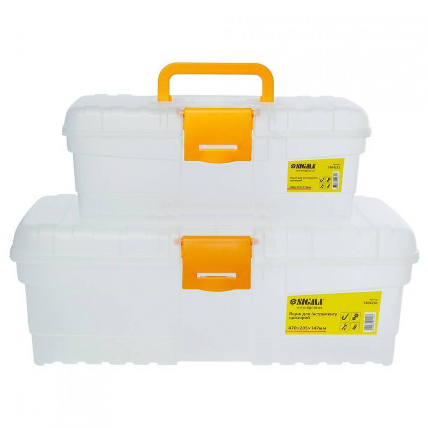 Набір ящиків прозорих для інструменту 2в1 300×155×110мм, 400×205×147мм Sigma (7404221) призначений для зберігання, транспортування, перенесення та зручного доступу до ручного інструменту. Допомагає системно організувати зберігання дрібних деталей: кріплення, шайб, гайок та інших дрібниць. Простота пошуку необхідних деталей забезпечується наявністю кількох секцій. Функціональний та знаходить застосування у багатьох сферах діяльності: перенесення індивідуальних інструментів, комплектація наборів інструментів та дрібних деталей для домашнього майстра, укладання дрібних предметів на відпочинку – рибалці, полюванні, рукоділлі; при комплектації необхідного набору інструментів та аксесуарів для автомобіля, майстерні, гаража або СТО та ін.