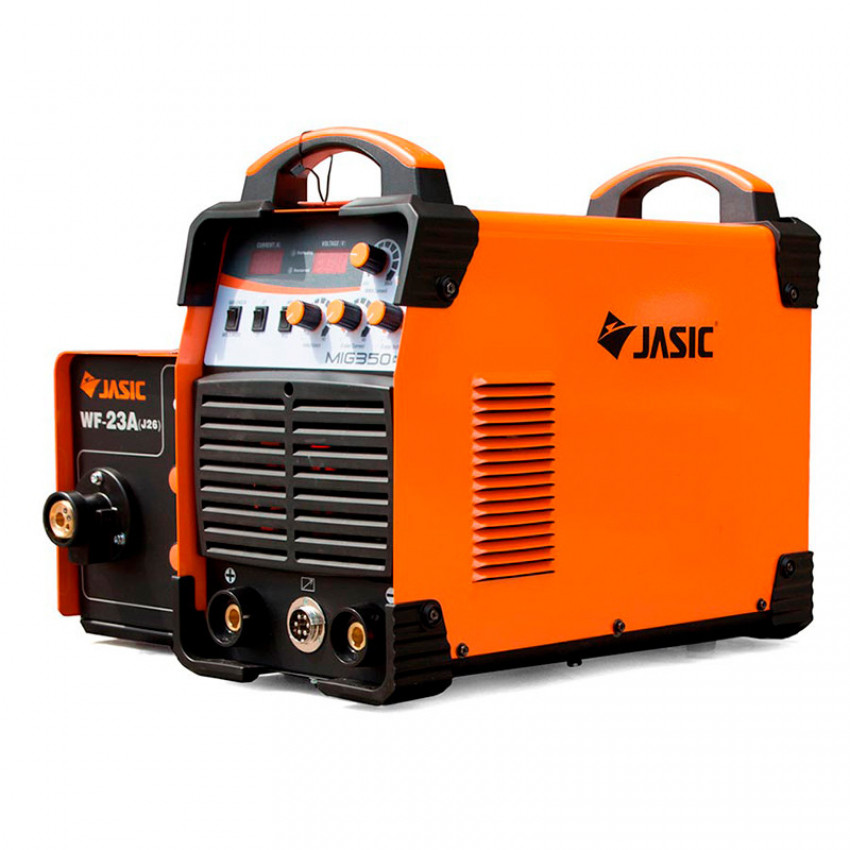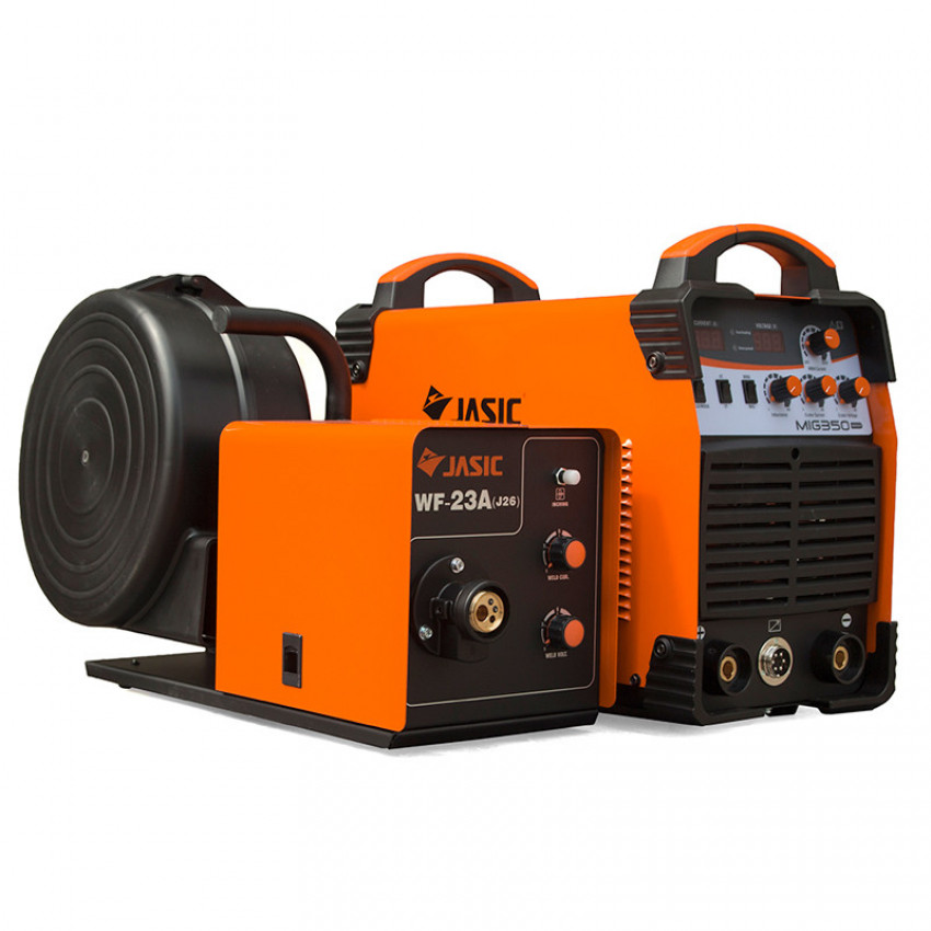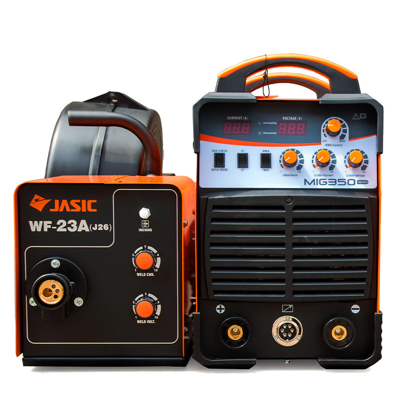 Jasic MIG-350 (N255) - це професійний зварювальний інвертор, який може використовуватися для напівавтоматичного зварювання в середовищі захисних газів (MIG/MAG). Апарат працює як дротом суцільного перетину, так і порошковом (потрібна заміна роликів механізму, що подає). Окрім роботи в режимі напівавтомату джерело також працює в режимі ручного дугового зварювання.