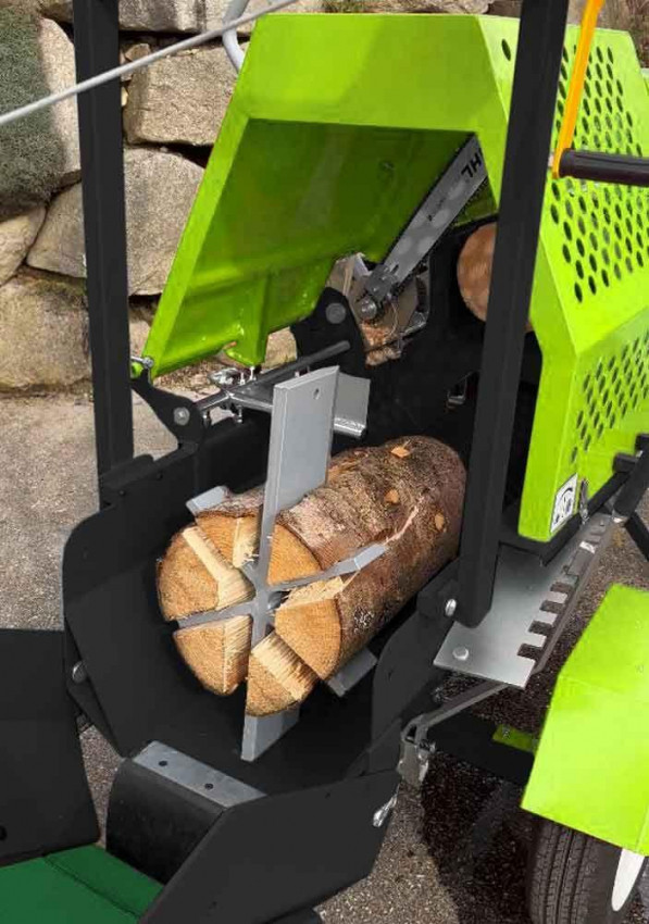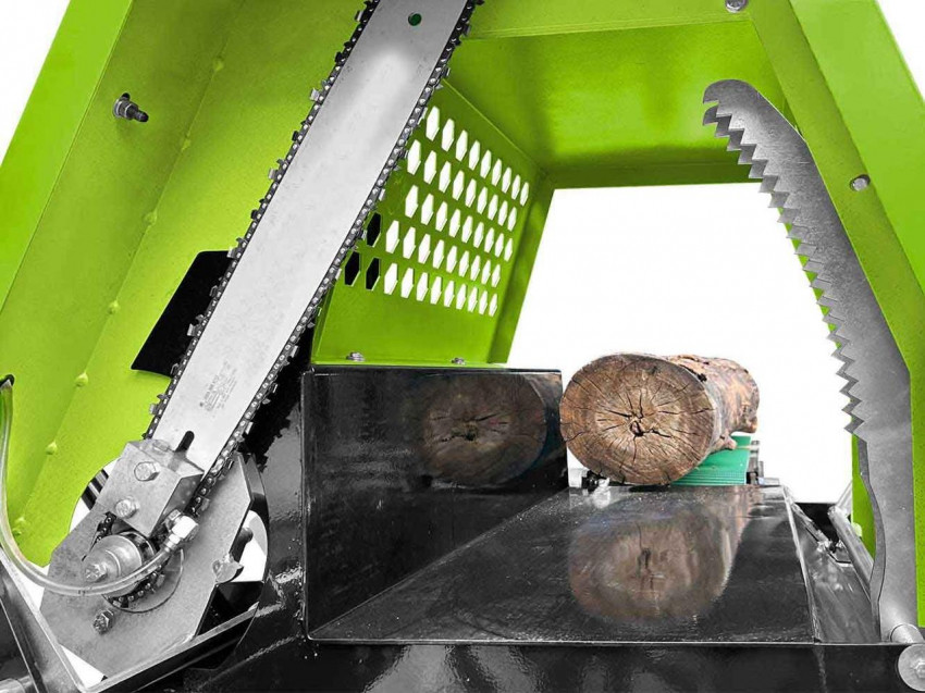 Пристрій має стрічковий конвеєр довжиною 1,1 м для подачі колод, а також вихідний конвеєр довжиною 3,2 м з кутом нахилу до 40°. Поворотний механізм конвеєра полегшує вивантаження готових дров. Для нарізання використовується полотно бензопили завдовжки 45 см (18 дюймів), яке дозволяє регулювати довжину полін від 190 до 530 мм.