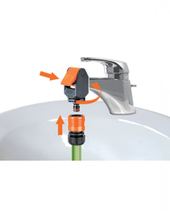 З'єднання Claber Koala для крана 3/4 дюйм має кубічну форму та використовується для забезпечення надійного, швидкого і зручного підключення шланга до звичайного єврозмішувач. Ця проста система дозволяє підключати до крана поливальний шланг, пральну або посудомийну машину. Процес підключення даного з'єднувача дуже простий: насадка одягається на змішувач, а шланг за допомогою перехідника з внутрішнім різьбленням діаметром 3/4 дюйма накручується на саму насадку.