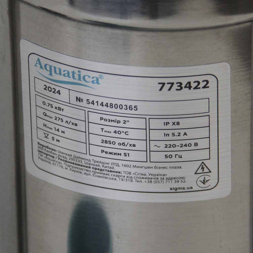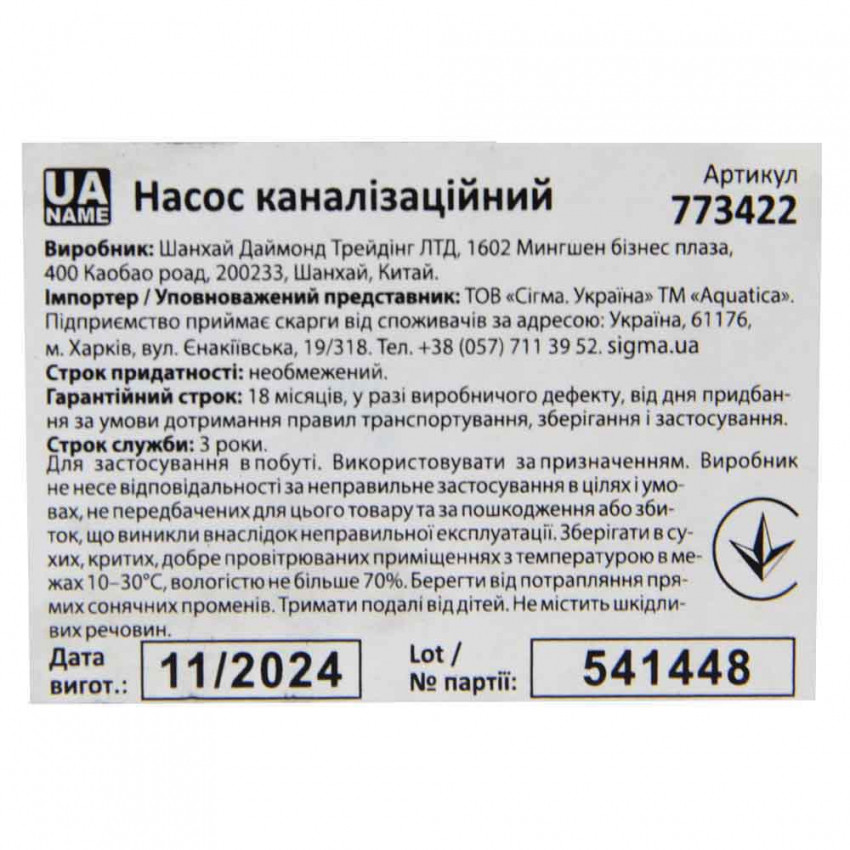 Про товар Насос каналізаційний 0.75кВт Hmax 14м Qmax 275л/хв (нерж) AQUATICA (773422)