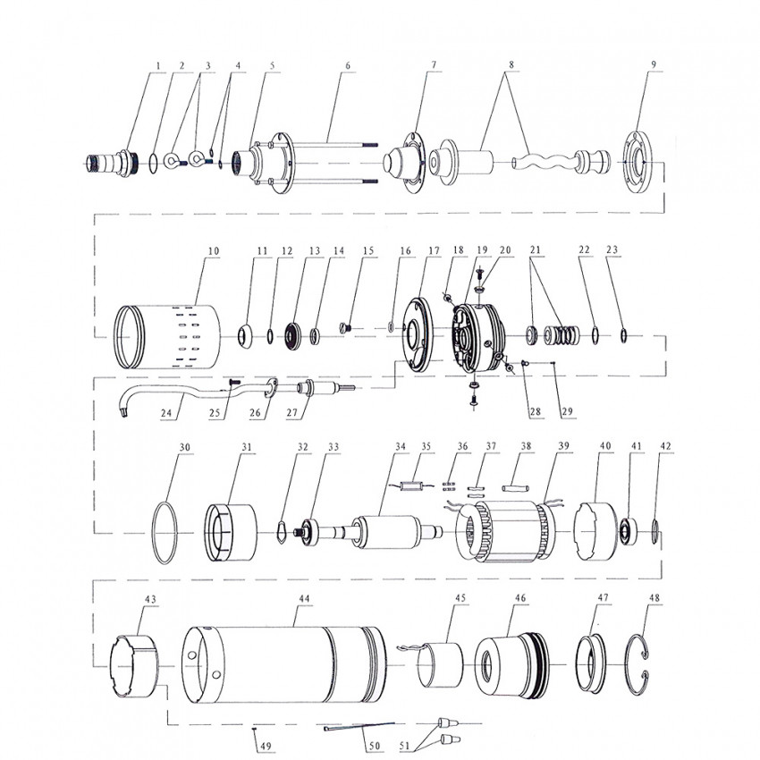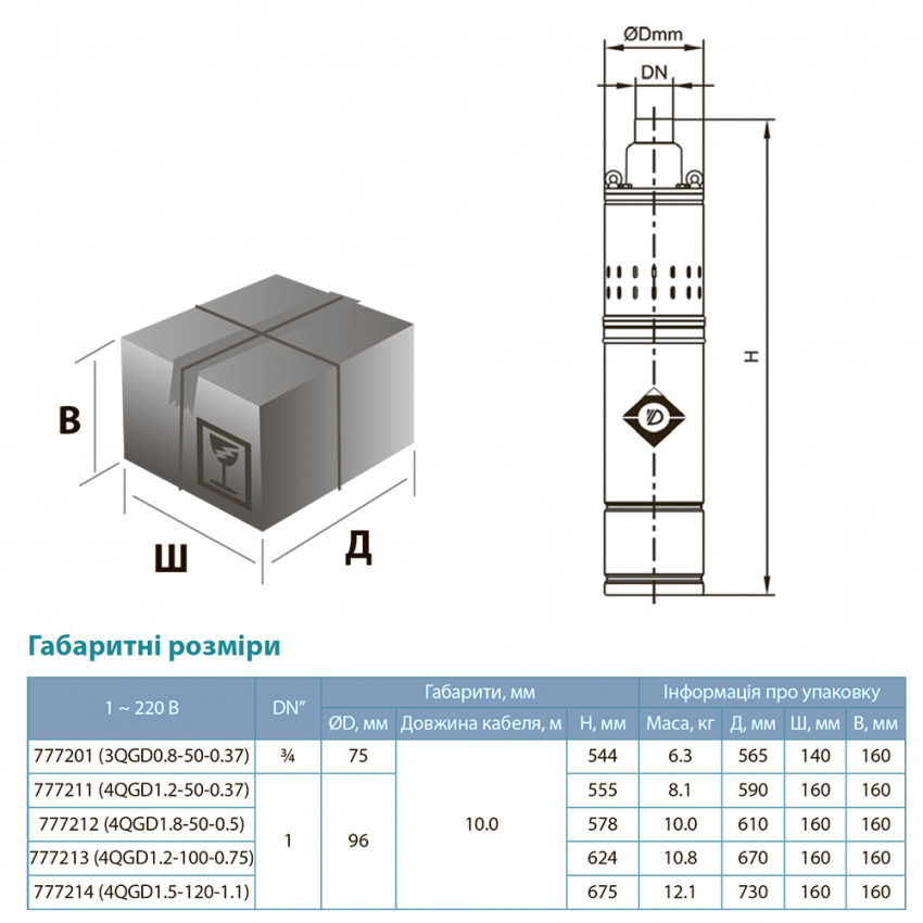 Насос шнековий свердловинний 1.1кВт H 190(116)м Q 45(25)л/хв Ø96мм (нерж) AQUATICA (DONGYIN) (777214) Насоси серії резервуарів (обов'язкова установка кожуха охолодження), для перекачування води в резервуари, для зрошувальних систем, для автоматичної подачі води разом із невеликими резервуарами під час використання керуючої автоматики (керуючі реле, контролери тиску). Насосна частина: Зовнішній діаметр: 96 мм; Корпус насосної частини: нержавіюча сталь AISI 304; Вихідний фланець: нержавіюча сталь AISI 304; Вал насосної частини: нержавіюча сталь AISI 304; Шнек: нержавіюча сталь AISI 304; Втулка шнека: гумово-металева; Зворотний клапан: гума. Електродвигун: Тип двигуна: асинхронний, маслонаповнений, з вбудованим в обмотку термозахистом; Обмотка статора: мідь; Корпус електродвигуна: нержавіюча сталь AISI 304; Вал двигуна: нержавіюча сталь; Механічне ущільнення у масляній камері: кераміка/графіт; Підшипник: кочення (C