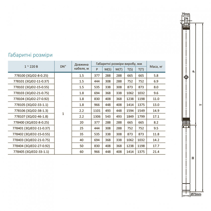 Про товар Насос відцентровий 0.75 кВт H 91(68)м Q 45(30)л/хв Ø80мм 40м кабелю mid AQUATICA (778403)