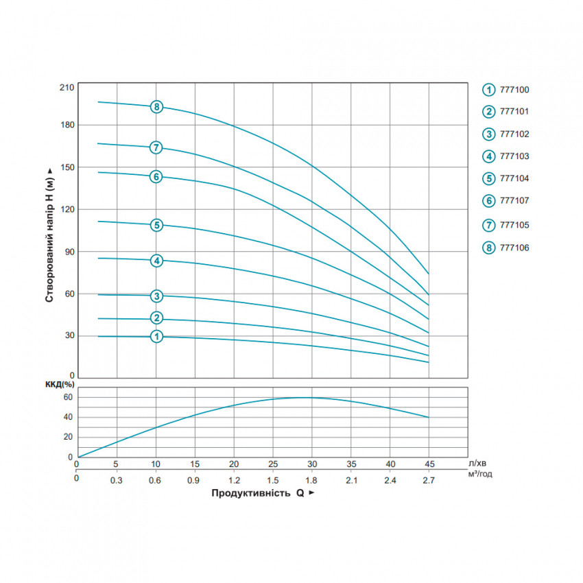 Насос відцентровий свердловинний 1.5кВт H 197(151)м Q 45(30)л/хв Ø80мм AQUATICA (DONGYIN) (777106) Насоси серії установка кожуха охолодження), для перекачування води в резервуари, для зрошувальних систем, для автоматичної подачі води разом із невеликими резервуарами під час використання керуючої автоматики (керуючі реле, контролери тиску). Насосна частина: Корпус насосної частини: нержавіюча сталь AISI 304; Вихідний фланець: латунь; Вал насосної частини: нержавіюча сталь AISI 304; Муфта валу: нержавіюча сталь AISI 304; Робоче колесо: технополімер; Шайба фасонна роздільна: технополімер; Дифузор: технополімер. Електродвигун: Тип двигуна: асинхронний, маслонаповнений, з вбудованим в обмотку термозахистом; Обмотка статора: мідь; Корпус електродвигуна: нержавіюча сталь AISI 304; Вал двигуна: нержавіюча сталь; Механічне ущільнення: кераміка/графіт; Підшипник: кочення (C