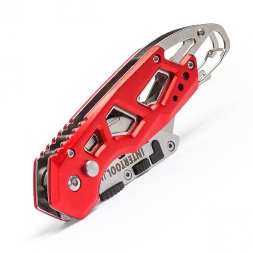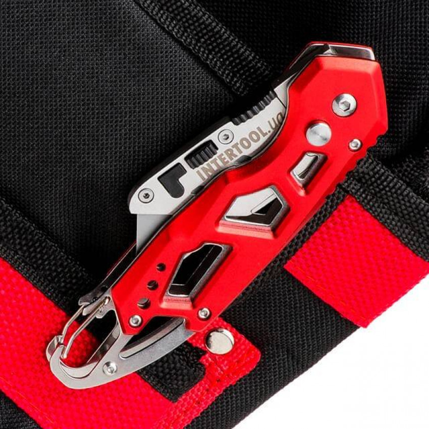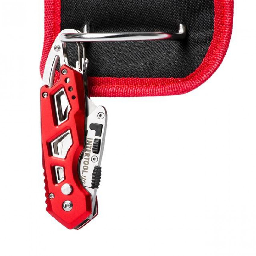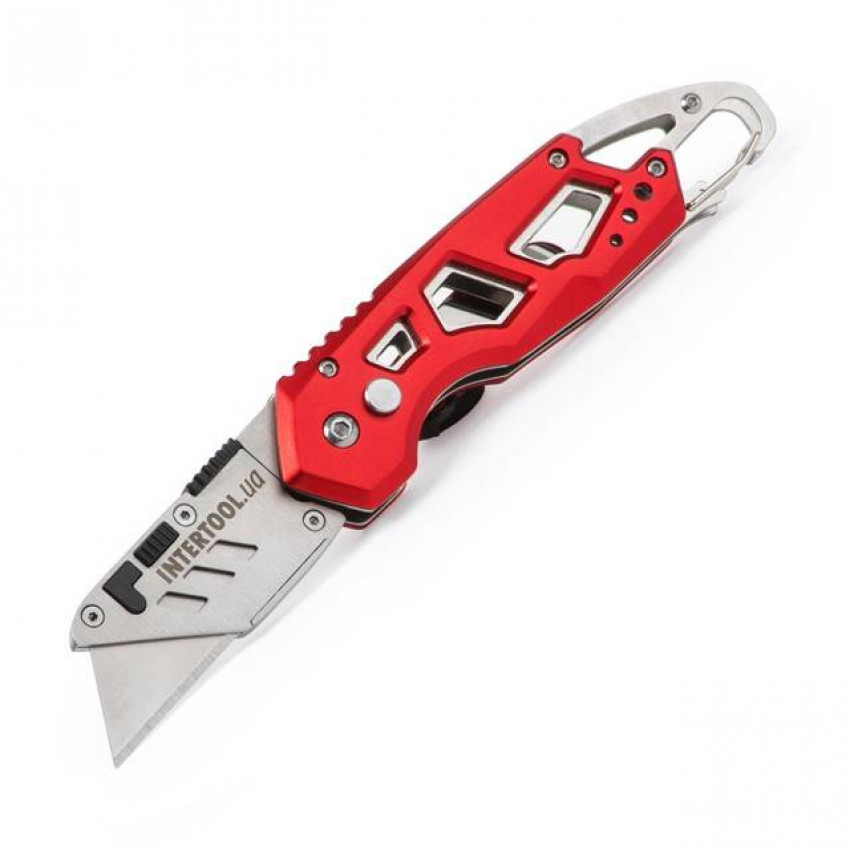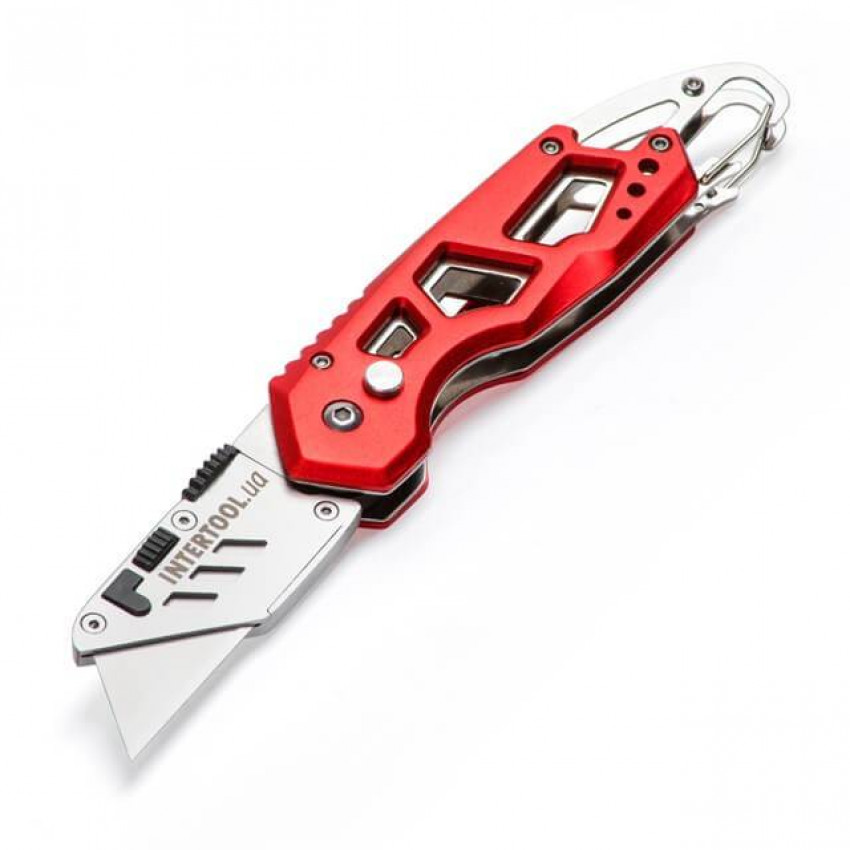 Важко уявити будь-який ремонт без будівельного ножа! Спеціально для сучасних професіоналів, фахівців і майстрів, для яких безпека, довговічність, та комфорт – пріоритети був створений будівельний ніж INTERTOOL HT-0531! папери та ін. Стане ідеальним помічником на будовах, складах, в магазинах, а також у побуті. .org.ua/instrument-dlya-otdelochnih-rabot/nozhi-i-skalpeli/lezviya-dlya-nozhey/intertool-ht-0519.html' target='_blank'>HT-0519). Затуплені край можна легко перевернути і працювати іншою стороною леза - і у вас в руках знову гострий інструмент! Матеріал виготовлення леза – японська сталь, марки SK5. Підвищений вміст вуглецю в сплаві робить лезо стійким до динамічних навантажень, і зберігає гостроту ріжучої кромки надовго. Сам ніж компактний і зручний - складана рукоятка дозволяє носити його в кишені. Легкий, він ідеально збалансований і зручно лежить в руці за рахунок скелетного типу рукоятки, яка виготовлена з міцного алюмінію.