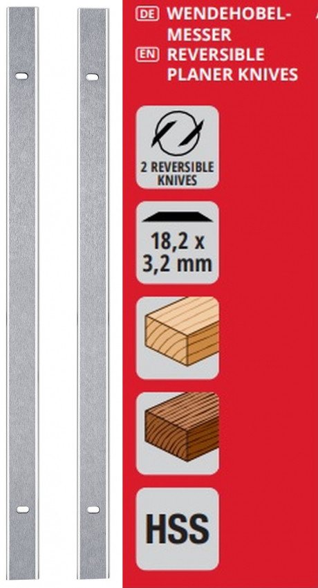Ці оригінальні двосторонні ножі для рубанка Einhell є сумісним аксесуаром або запасною частиною для стаціонарних рубанків Einhell. Два ножа для рубанка особливо підходять для стаціонарного рубанка Einhell TE-SP 330. Обидві сторони кожного ножа мають гостру ріжучу кромку, що дозволяє використовувати обидві сторони двосторонніх ножів та забезпечує гладкі поверхні та ідеальне стругане покриття. Виготовлені з високоякісної швидкорізальної сталі, ножі для рубанка довжиною 332 мм також підходять для ширших заготовок та забезпечують тривалий термін служби. У комплекті два двосторонні ножа для рубанка, що можуть заточуватися, для стаціонарного рубанка Einhell TE-SP 330.