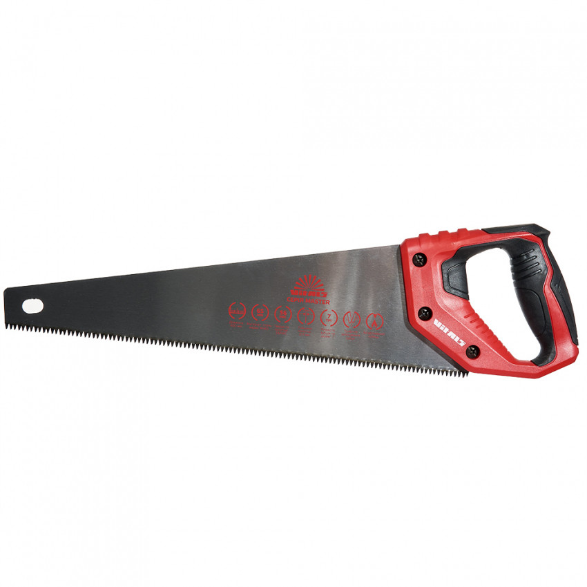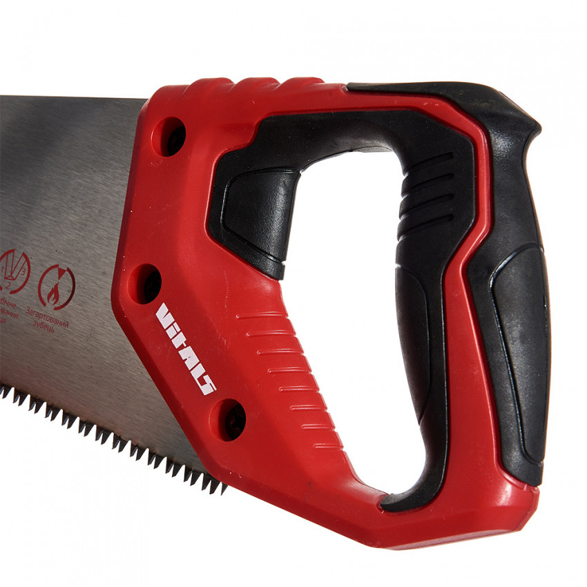 Ножівка по дереву 400 мм 7 з/д сталь Mn65 Vitals Master призначена для поздовжнього та поперекового розпилу заготывель середніх та маленьких розмірів з деревини м'яких та твердих порід, розпилу ДСП, фанери та ПВХ.