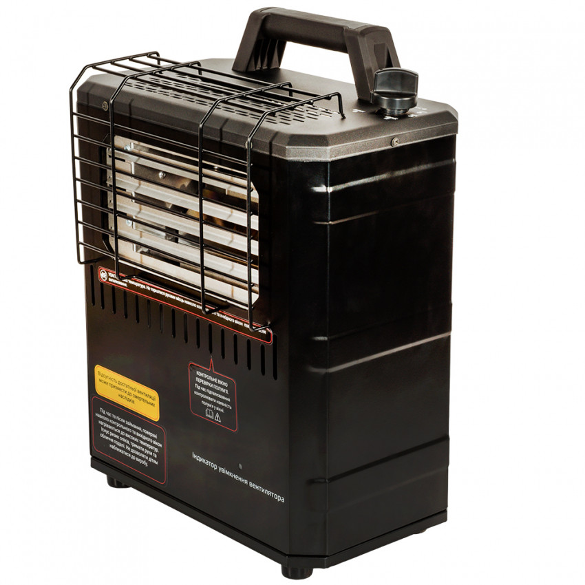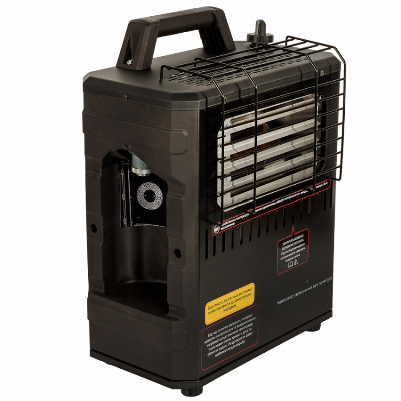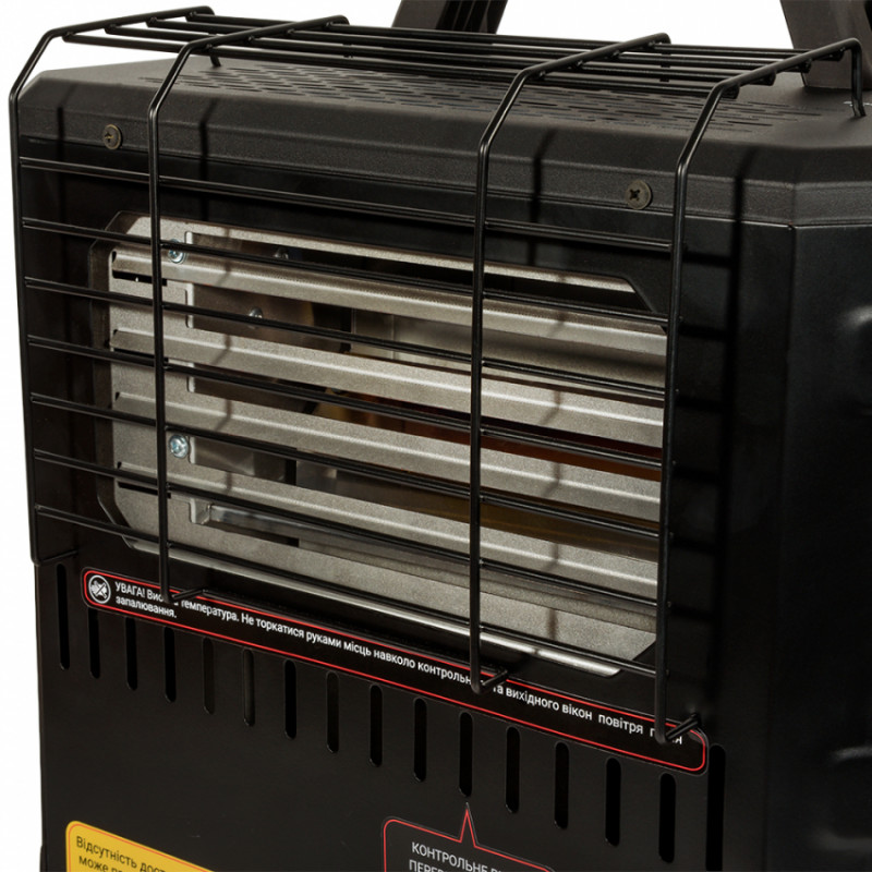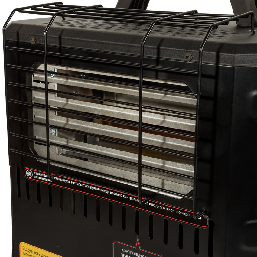 Для безпечної роботи обігрівач оснащений трирівневим захистом: автоматичне відключення газу у разі зникненні полум’я, датчик перегріву (спрацьовує при 75°C) та захист від перекидання. П’єзоелектричний підпал запускає пристрій одним натисканням — без сірників чи запальничок. Захисні решітки на всіх вентиляційних вікнах запобігають опікам і травмам. Клас захисту IP20 та низька напруга (5-12 В від елемента Пельтьє) гарантують безпеку навіть за умов підвищеної вологості. Шум — лише 60 дБ, вібрація — мінімальна.