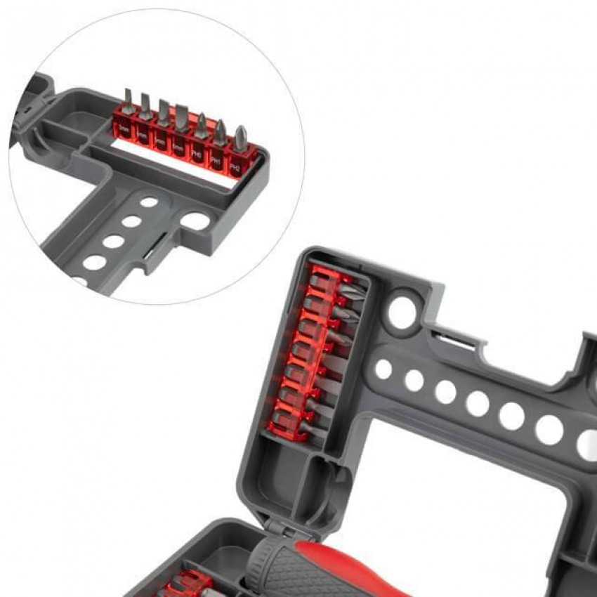 Весь набір упакований в компактний кейс, де викрутка відіграє роль ручки. Це дозволяє економити простір під час зберігання, а також зручно транспортувати комплект.