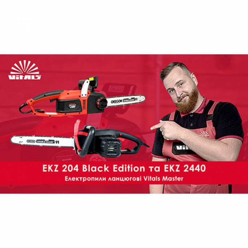 Пила електрична Vitals Master EKZ 204 Black Edition - потужна якісна напівпрофесійна модель унікального дизайну, яка стане незамінним помічником у домашньому господарстві. Висока продуктивність ланцюгової електропили – це результат використання потужного електричного двигуна, а також якісних шин та ланцюгів від всесвітньо відомої ТМ «Oregon». Крім високої потужності електродвигун характеризується також високою якістю виконання - якісна заливка ротора, обмотки статора і ротора виготовлені зі 100% міді. Крім цього, надійність і довговічність роботи виробу підтверджується високоякісними комплектуючими: шестерня редуктора виготовлена з особливо міцної сталі, якісні підшипники, надійні латунні щіткотримачі, ударостійкий пластик (поліамід). Характерна особливість: електропила забезпечена високоякісним автоматичним масляним Для відображення інформації про рівень масла передбачений покажчик. Модель Vitals Master EKZ 224 Black Edition має поперечне розташування електродвигуна, а значить більш просту та надійну конструкцію, завдяки чому отримуємо менші втрати потужності в редукторі. Цікавою особливістю пили є конструкція механізму безключового натягу ланцюга. Спеціальним гвинтом-баранчиком кріпиться кришка шини. Для того, щоб відрегулювати натяг ланцюга, необхідно послабити гвинт, а потім за допомогою зубчастого коліщатка підтягнути або послабити ланцюг. Після цього закріпити кришку шини. Конструкція максимально проста та надійна. Щоб уникнути травм у разі віддачі або «зворотного удару», моментально спрацьовує аварійне гальмо, що блокує рух ланцюга. Час спрацьовування гальма ланцюга становить 0,12 секунд. Завдяки високій продуктивності, якості виконання, а також зручності, простоті використання та обслуговування, ланцюгова електропила Vitals Master EKZ 204 Black Edition завоювала заслужену довіру користувачів.