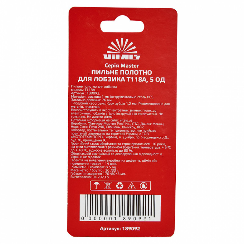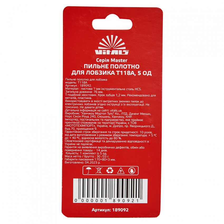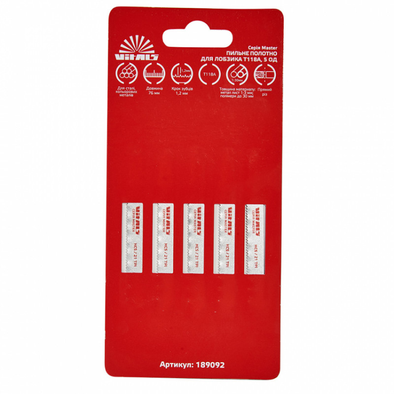 Пиляльне полотно для лобзика Vitals Master T118A 5 од. підходить для чистого прямого різання металу товщиною від 1 до 3 мм. Полотно виготовлене зі сталі HSS, яка має високу міцність, твердість і зносостійкість. Полотно має 21 зуб на дюйм (TPI) і довжину 77 мм, що забезпечує чистий та акуратний різ без сколів.Підходить для лобзиків з системами кріплення під Т-подібний хвостовик.Поставляється в упаковці по 5 штук.Пильне полотно для лобзика Vitals Master T118A 5 одиниць.