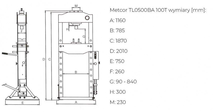 Пневматично-гідравлічний прес METCOR TL0500BA 100 т - це ефективне обладнання для запресовування-випресовування, вирівнювання, згинання, штампування, рихтування та формування металоконструкцій на автосервісах, а також в ремонтних, монтажних і виробничих майстернях. Завдяки зусиллю 100 тонн підходить для важких промислових задач, а ширина столу 785 мм і регулювання його висоти на 9 рівнів у діапазоні 90-840 мм дозволяють працювати із заготовками різного розміру.