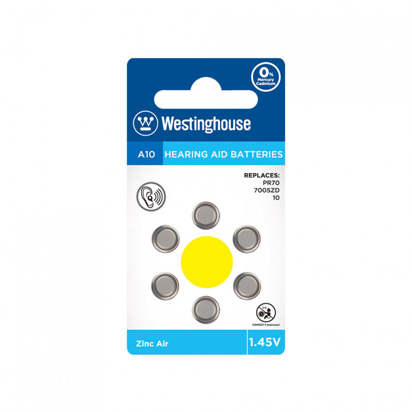 Спеціальні повітряно-цинкові (Zink Air) елементи живлення Westinghouse відрізняються від інших елементів такого ж розміру найбільшою енергомісткістю, яка навіть перевищує енергомісткість літій-іонних акумуляторів. Завдяки цій особливості елементи слугуватимуть набагато довше ніж інші елементи того ж розміру. Тривале живлення для слухового апарату. 4 роки зберігання. Легко відкривати та використовувати. Виготовлені без ртуті для захисту довкілля. Упаковані в блістері по 6 шт.