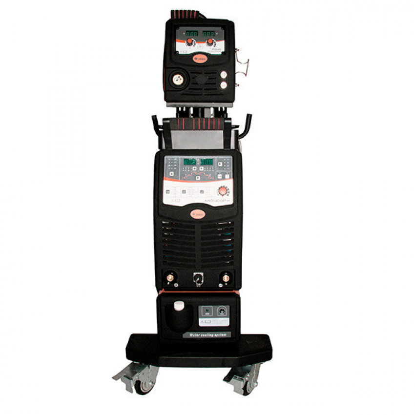 Jasic MIG-400P (N317) - це повноцінний мобільний зварювальний пост. В комплект постачання входить візок з підставкою для балона з газом, блок рідинного охолодження (4.5 л), пальник з рідинним охолодженням і турель для механізму подавання дроту. Турель дозволяє обертання пристрою подавання дроту на 360°. Зварювальний пальник підключається через роз'єм типу KZ-2, який винесений на корпус пристрою подавання дроту. Для роботи пальника пістолетного (Spool Gun) типу з вбудованою котушкою на передній панелі джерела встановлено окремий роз'єм (7 pin). Інвертор працює під керуванням високошвидкісного процесора. Синергетична система керування дозволяє підібрати режим зварювання в залежності від типу і товщини дроту, а також від типу захисного газу. Також є можливість записувати власні режими зварювання. Живлення апарату від промислової електричної мережі 380В (3 фази).