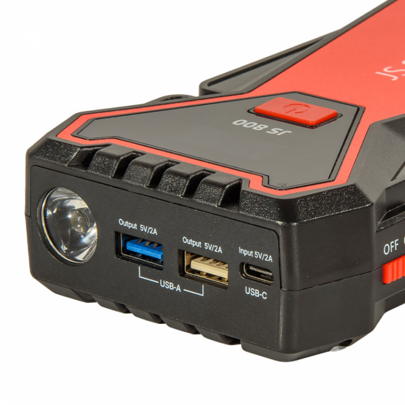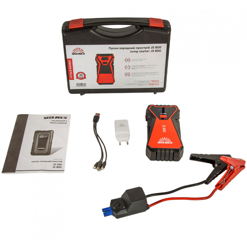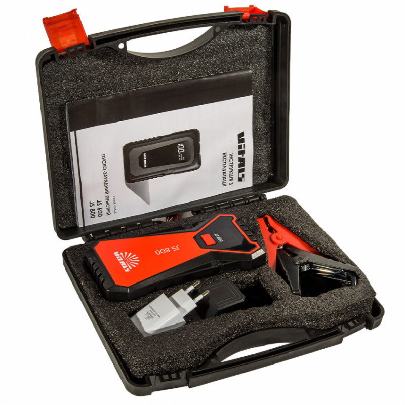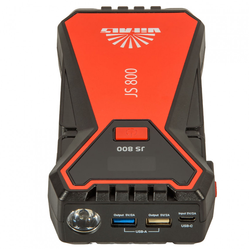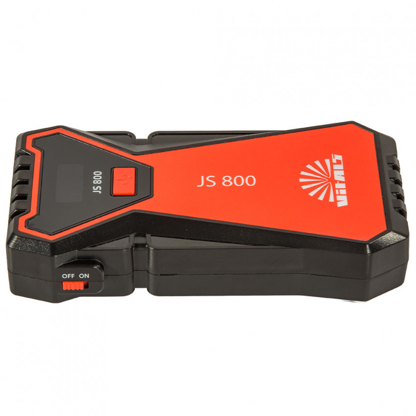 Vitals JS 800 — це компактний мобільний пуско-зарядний пристрій із літій-полімерною батареєю. Він призначений для швидкого запуску автомобілів із розрядженим акумулятором та одночасно слугує портативним джерелом живлення для гаджетів і аварійного освітлення.