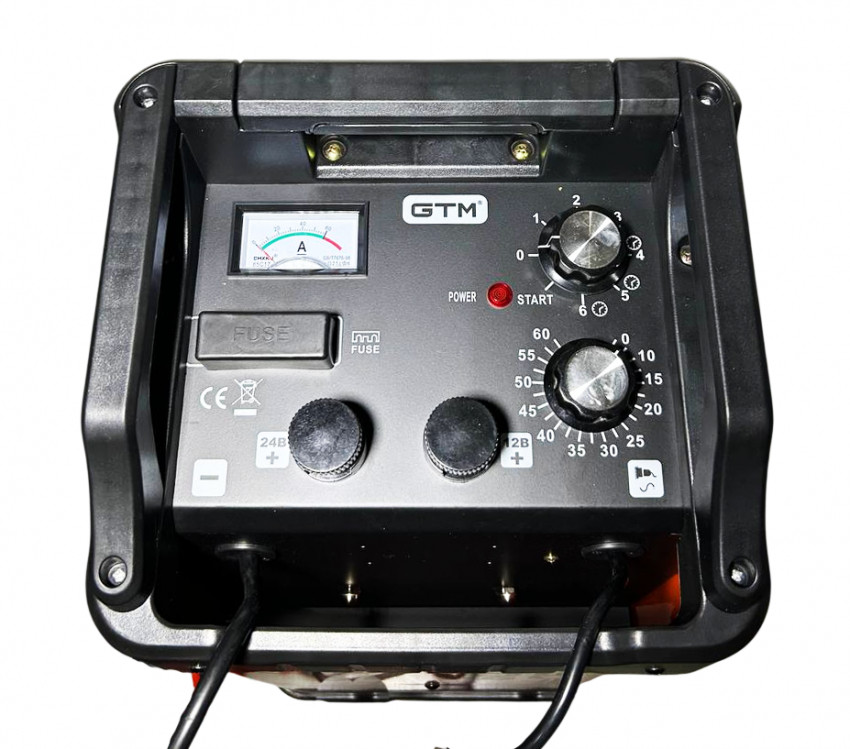 На передню панель пускозарядного винесено: амперметр;перемикач режимів зарядка/старт; таймер; клема + 12В; кабель(-) з затискачем; клема+24В; запобіжник.