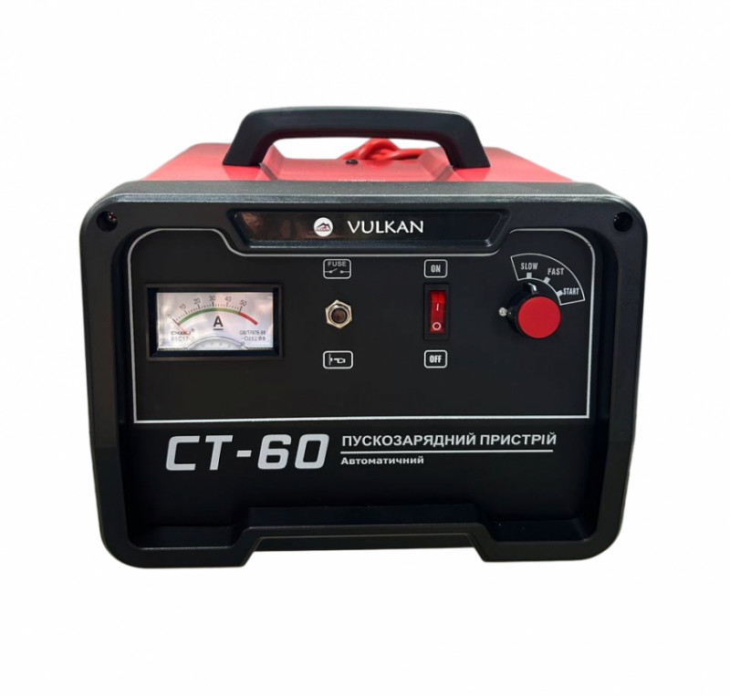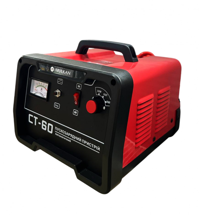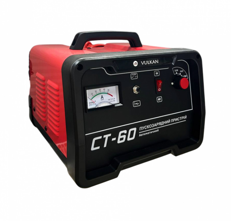 Зарядний пристрій Vulkan CT60 призначений для зарядки акумуляторних батарей напругою 12В та 24В, ємністю до 450Aг, також для запуску двигунів транспортних засобів сумісно з акумуляторною батареєю напругою 12В або 24В. Запуск двигунів проводиться за допомогою короткочасної подачі струму до 120А. Пристрій трансформаторного типу, з мідною обмоткою трансформатор.