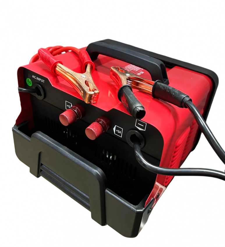 На передню панель пускозарядного винесено: амперметр; запобіжник; кнопка увімкнення; перемикач функцій повільнийшвидкий зарядстарт.