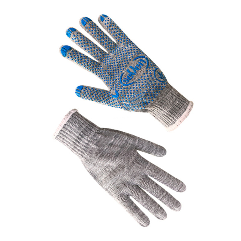 Матеріал: - основа: бавовна 70%, полієстер 30% ; - покриття: ПВХ з малюнком "seVen" ; Особливості: - колір основи: сірий; - покриття: синій; - кількість ниток - 3; - клас в'язки - 10; - розмір: 9; - вага пари: 39г; Кількість в упаковці 10 пар; Вага упаковки 0,390 кг; Группова упаковка - поліетиленовий мішок; Кількість пар в групповій упаковці - 300 пар.