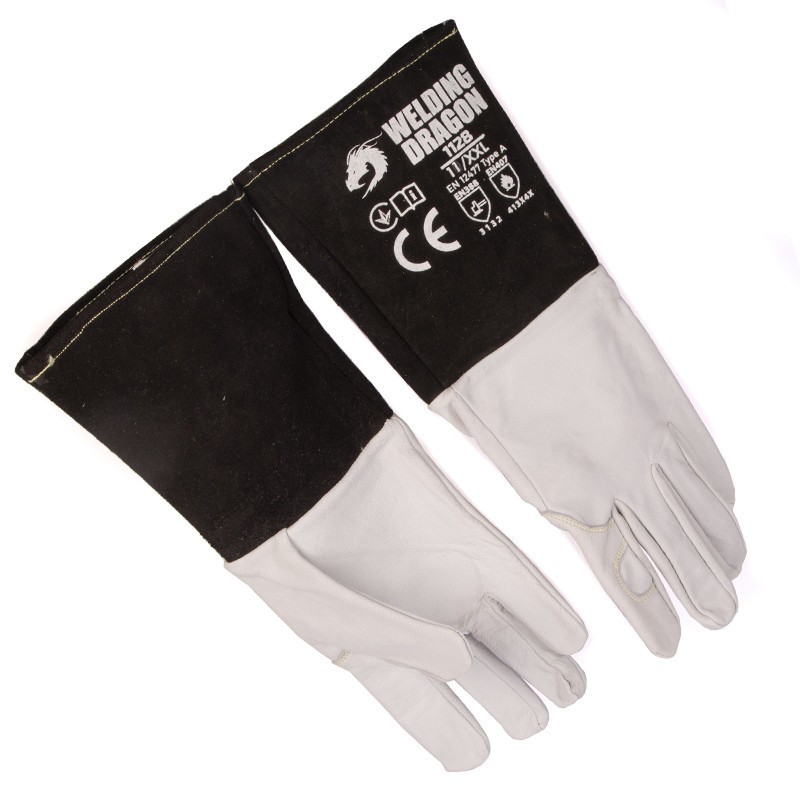 Рукавички зварювальника TIG Welding Dragon 1123 захищають руки під час робіт при аргонодуговому зварюванні. Модель є комбінацією двох різних видів матеріалів: крага - це спилок коров'ячої шкіри, долоня - гладка козяча шкіра. Зап'ясток зварювальника надійно захищений, а гладка шкіра на долоні дозволяє впевнено тримати пальник та керувати ним. Шви прошиті вогнетривкою кевларовою ниткою. У долонній частині підкладка з кевларової тканини для посилення стійкості рукавичок до механічних порізів та високих температур.