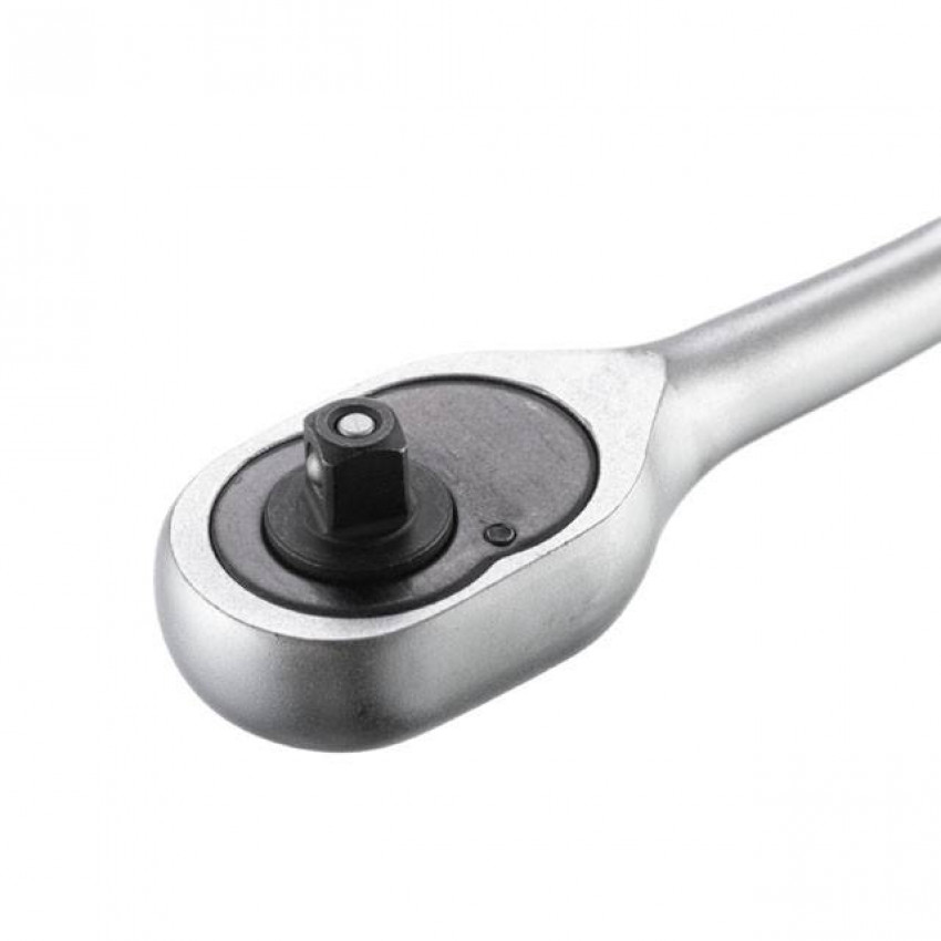 Тріскачка повністю виготовлена з Сr-V сталі, що гарантує виняткову міцність та стійкість до зносу. Храповий механізм на 45 зубців забезпечує надійність та плавність ходу.