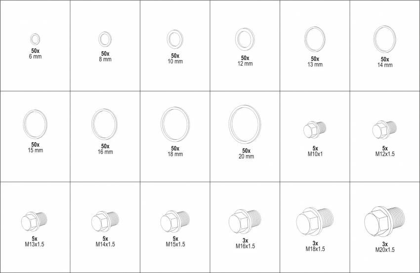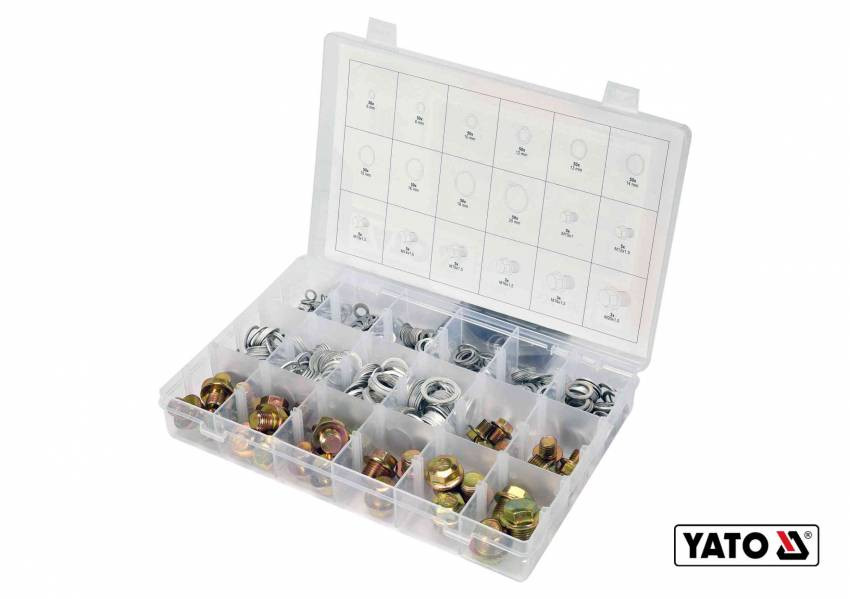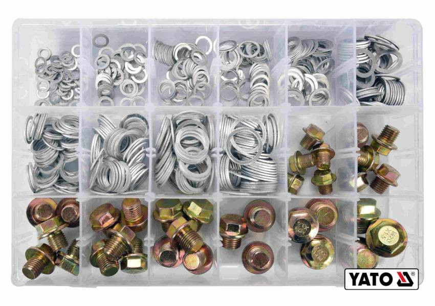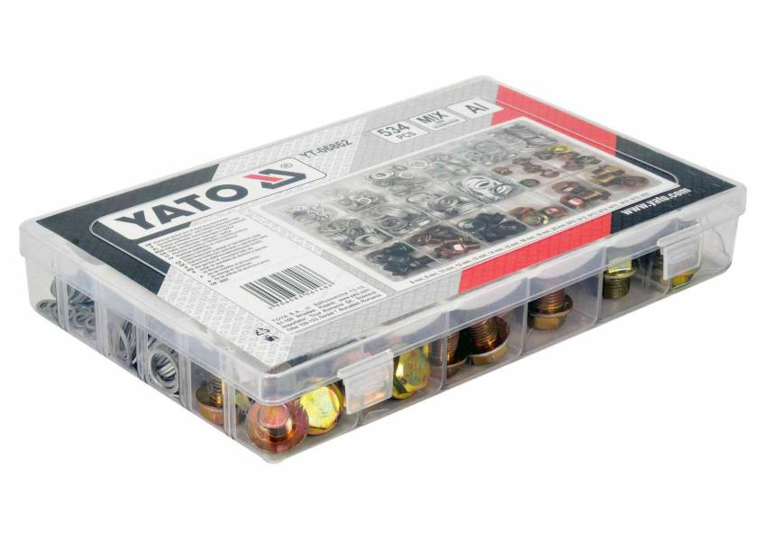 Шайби Ø6-20 мм та заглушки М10-М20, алюмінієві YATO у пластиковій коробці, набір, 534 шт.