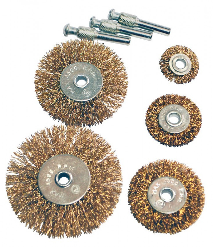 Про товар Щітки MASTERTOOL з латуньованого рифленого дроту 5 шт (дискова 25/40/50/63/75 + стрижень 1/4") 19-9500
