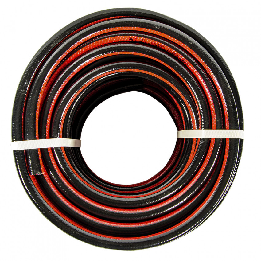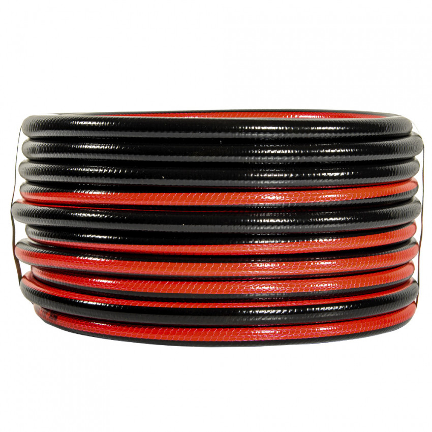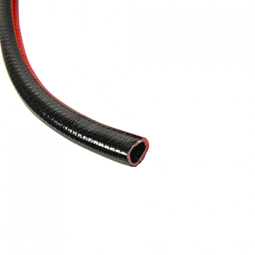 Шланг садовий для поливу Vitals Master "Quattro" - це високоякісний та зручний шланг для поливу саду, городу, газону чи клумб. Шланг має діаметр ½" і довжину 30 м, що дозволяє охопити велику площу поливу. Шланг виготовлений з полівінілхлориду (ПВХ), який має високу міцність, еластичність і стійкість до впливу води, ультрафіолетового випромінювання та наростання водоростей. Шланг має чотири шари. Прозорий зовнішній шар виконує роль захисту шлангу від механічних пошкоджень та стирання. Сітчасте обплетення з міцної синтетичної нитки, що становить проміжний шар, робить шланг стійким до розтягування та розривів. Третій шар додатково збільшує загальну товщину шланга та його здатність зберігати форму під час експлуатації та зберігання. Внутрішній шар із гладкою стінкою не створює перешкод потоку рідини усередині шланга. Шланг має робочий тиск 20 бар та тиск на розрив 25 бар, що гарантує безпеку та довговічність роботи. Шланг має робочу температуру від – 5 °С до + 45 °С, що дозволяє використовувати його в різних кліматичних умовах.