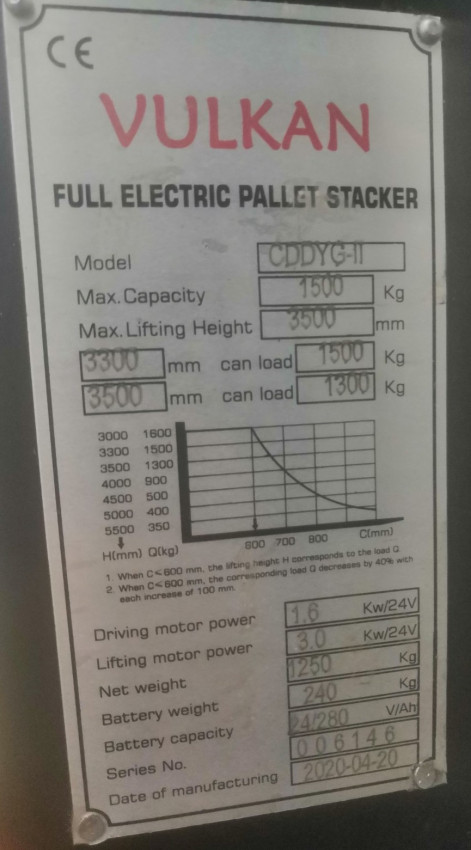 Штабелер електричний гідравлічний самохідний Vulkan CDDYG-II (3,5) – це складське обладнання призначене для переміщення та підіймання вантажу вагою до 1500кг на максимальну висоту 3.3м та мінімальну висоту 90мм. Штабелер використовується в пунктах навантаження-розвантаження, на складах, в супермаркетах, на гуртових базах та підприємствах. Ця складська техніка кращий вибір коли потрібно оперативно переміщати продукцію в приміщенні, підіймати та опускати її зі стелажів. Відмінними рисами елекроштабелера CDDYG-II є висока функціональність при невибагливості й простоті використання.