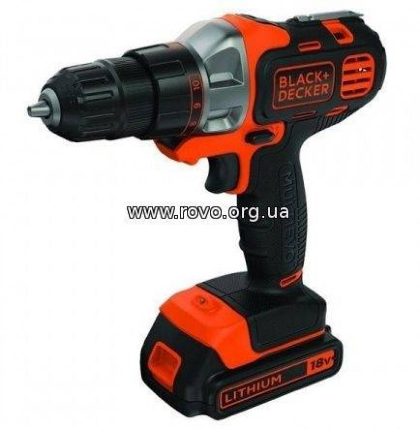 Характеристики Шуруповерт BD акумуляторний. у наборі з 2-ма (Li-ion) акумуляторами 18В. 1,5А/рік. змінні насадки