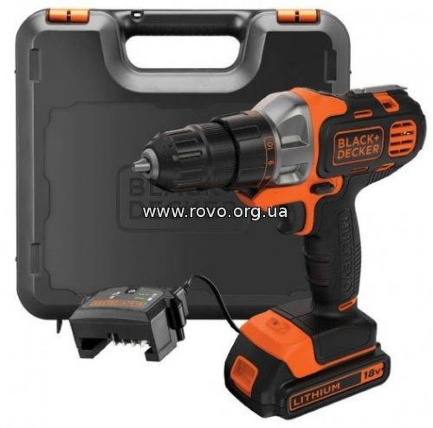 Характеристики Шуруповерт BD акумуляторний. у наборі з (Li-ion) акумулятором 18В. 1,5А/рік. змінні насадки