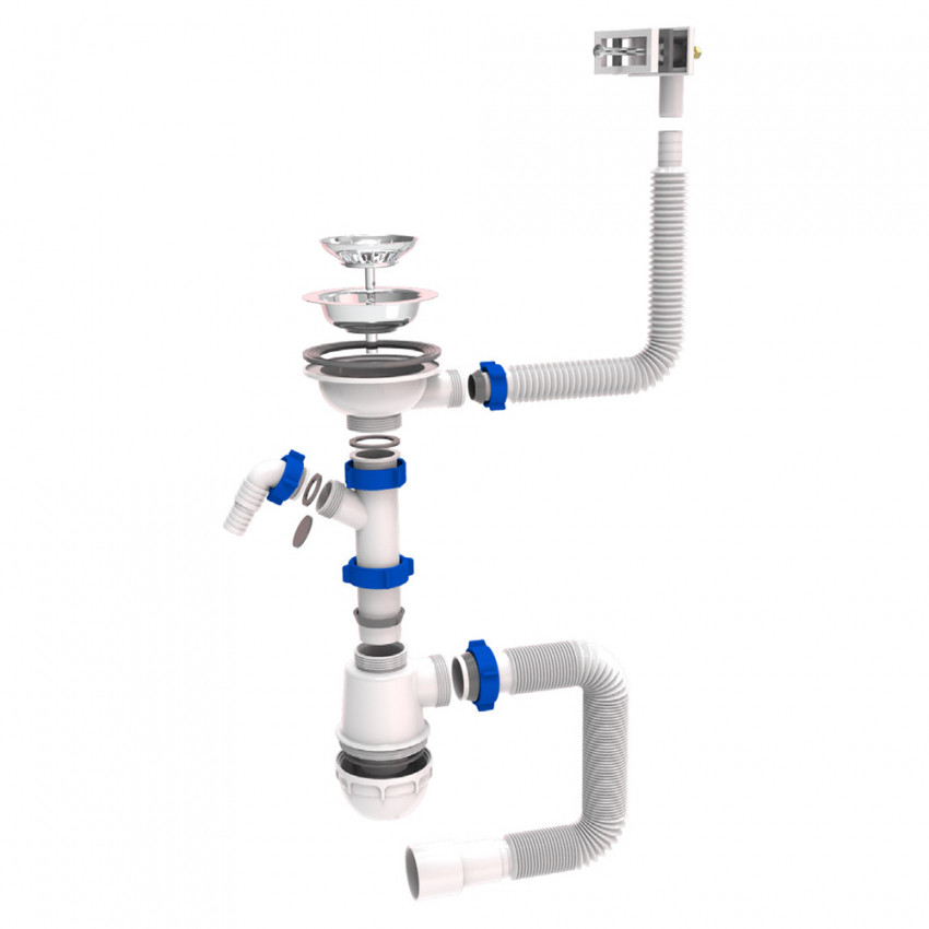Характеристики Сифон для кухонної мийки з нержавіючим випуском 3½" виводом під пральну машину, квадратним переливом і гнучким відведенням Ø40/50мм TAU (9842521)