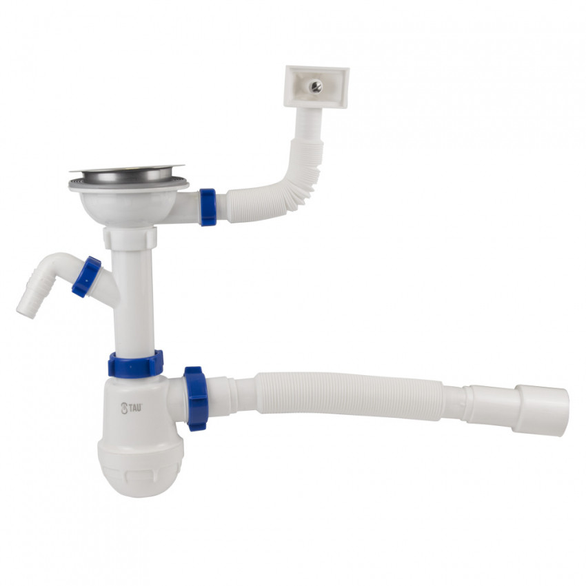 Відгуки Сифон для кухонної мийки з нержавіючим випуском 3½" виводом під пральну машину, квадратним переливом і гнучким відведенням Ø40/50мм TAU (9842521)